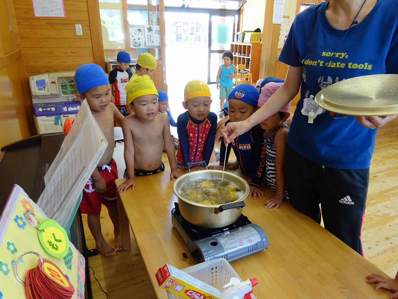 少し小さめのじゃがいもを一人一個ずつ洗い、鍋の中で入れました。水を入れてゆでて、ぐつぐつし始めると子ども達は「いいにおいがするね」「ぐつぐついってる」などと言いながら、目を輝かせて見ていました。