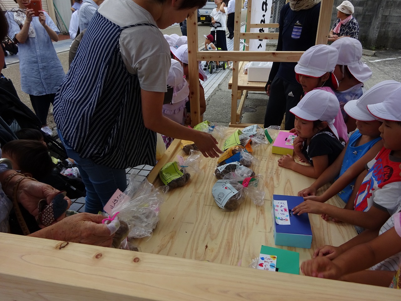 そこで、今年は年長さんが代表で地域の方々の協力もあり天領朝市にて販売することになり、年長たんぽぽ組が一回目の出店をすることとなりました。