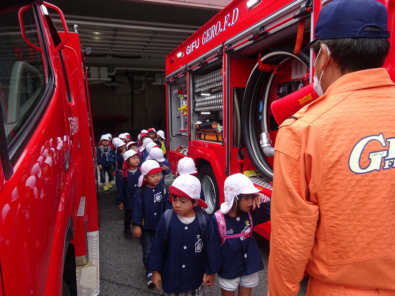 中消防署では、署内や消防車や救急車を見せてもらい、サイレンもそれぞれ聞かせてもらい違いが分かったようです。