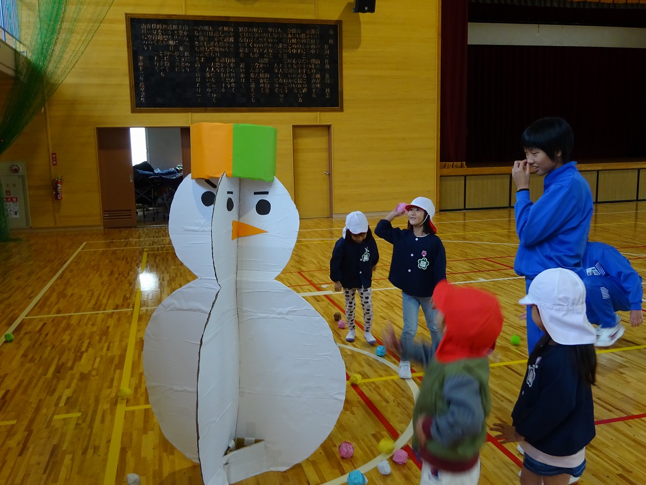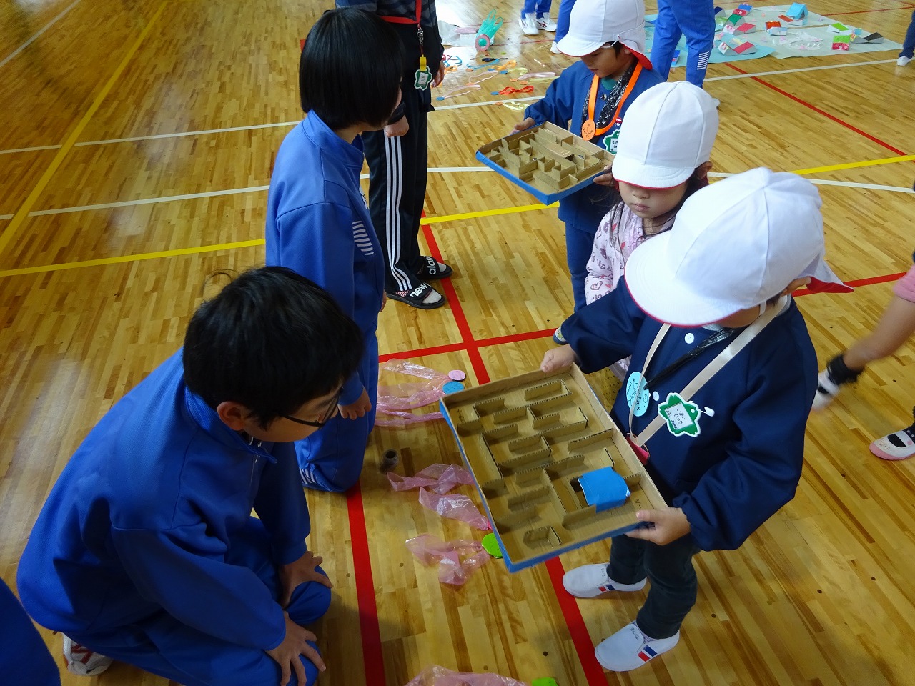 年長さんが南中学校へ出かけ、3年生の皆さんと一緒に楽しみました。 南中学校へ着くとお兄さんお姉さんが優しく出迎えてくれました。 体育館に入ると、玉入れ、もぐらたたき、迷路、すごろく、魚釣りなどアイデアいっぱいのゲームが準備されていました。