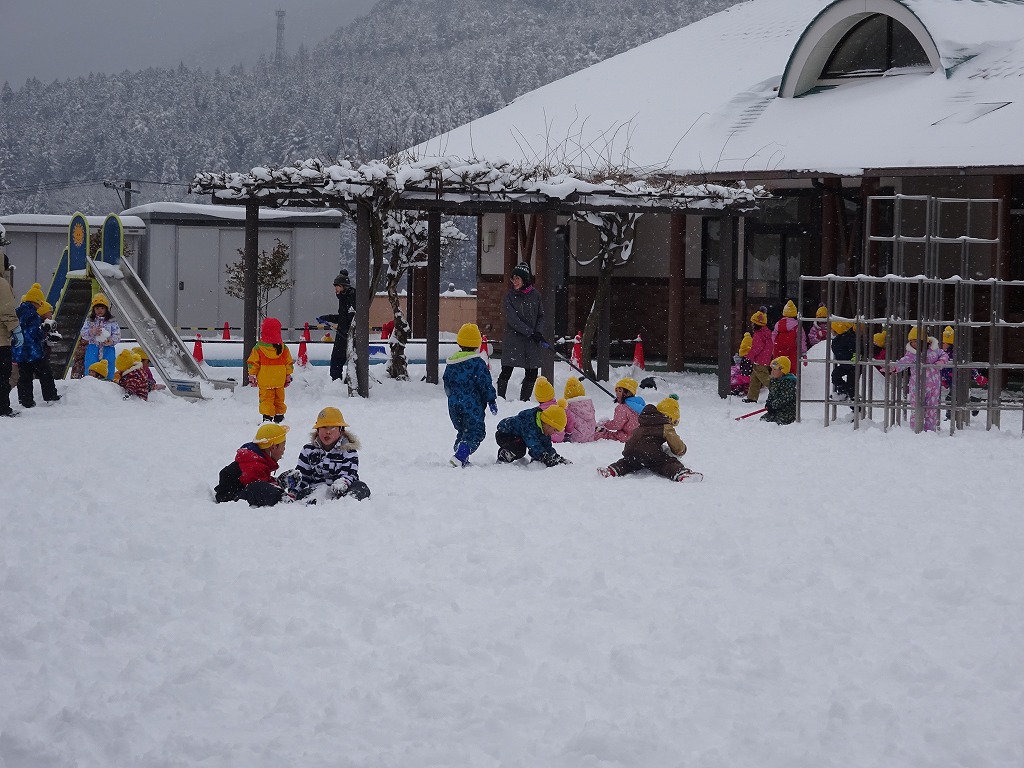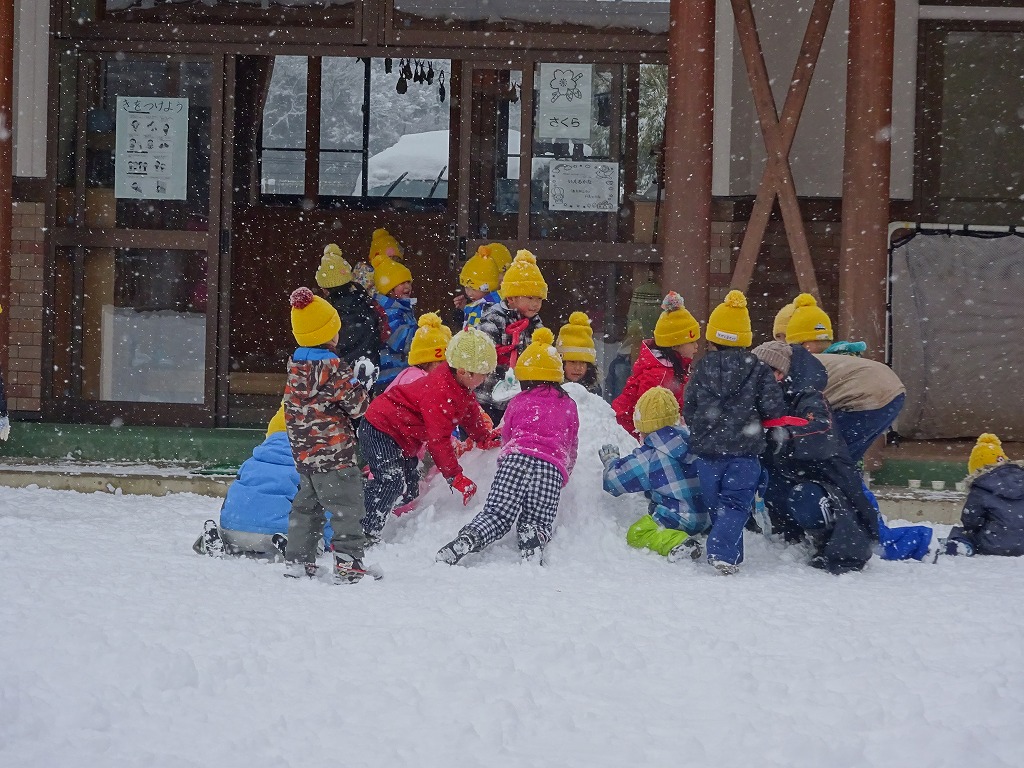 昨日からの雪で、今年一番の積雪になりました。 子ども達は園庭へ一目散! 寝転んだり、雪を投げたり、そりをしたり、雪だるまを作ったり・・・そして、あちこちに“かまくら”ができていきました。