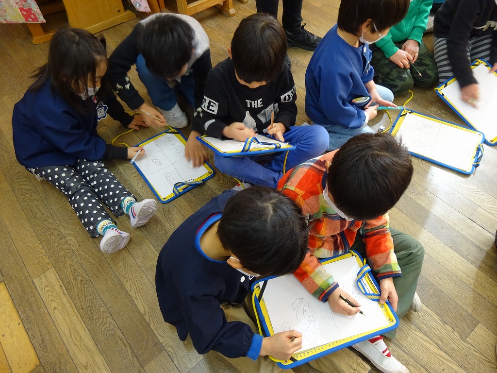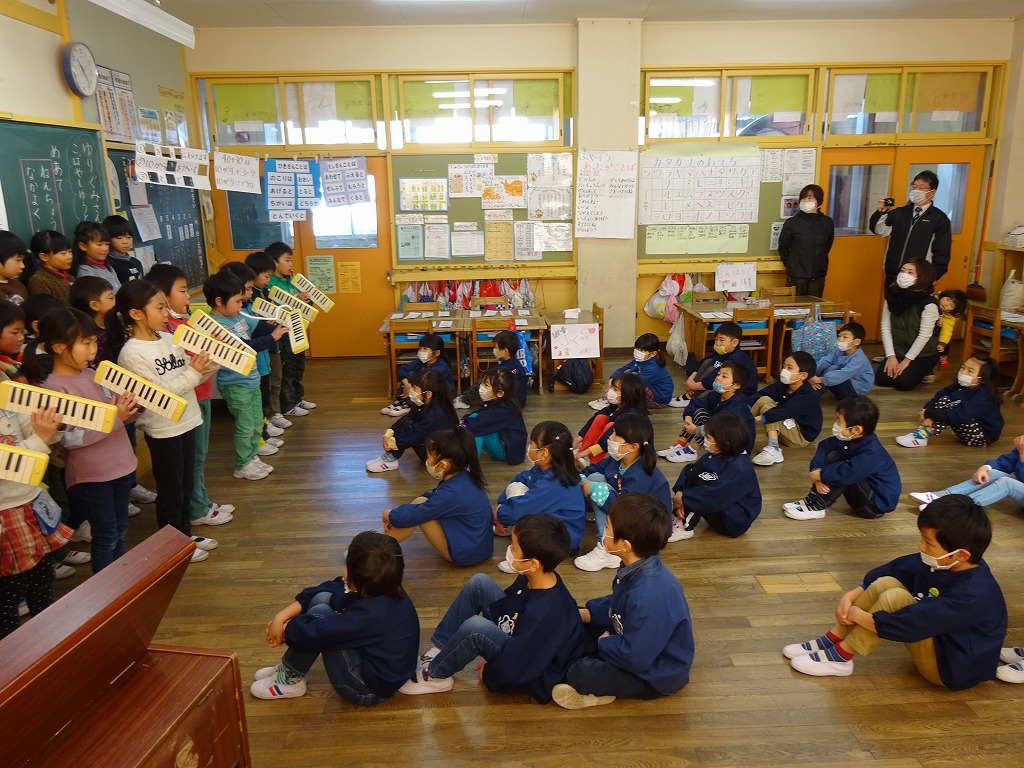 年長さんは、萩原小1年生との交流会に萩原小学校へ行ってきました。 1年生の皆さんに、クラス毎に教室に案内してもらいました。 教室では、鍵盤ハーモニカの演奏、絵描き歌、買い物ごっこと盛りだくさん! 初めて教室に入るので少し緊張気味の年長さんでしたが、1年生の皆さんの優しい声掛けで、とても楽しむことができました。