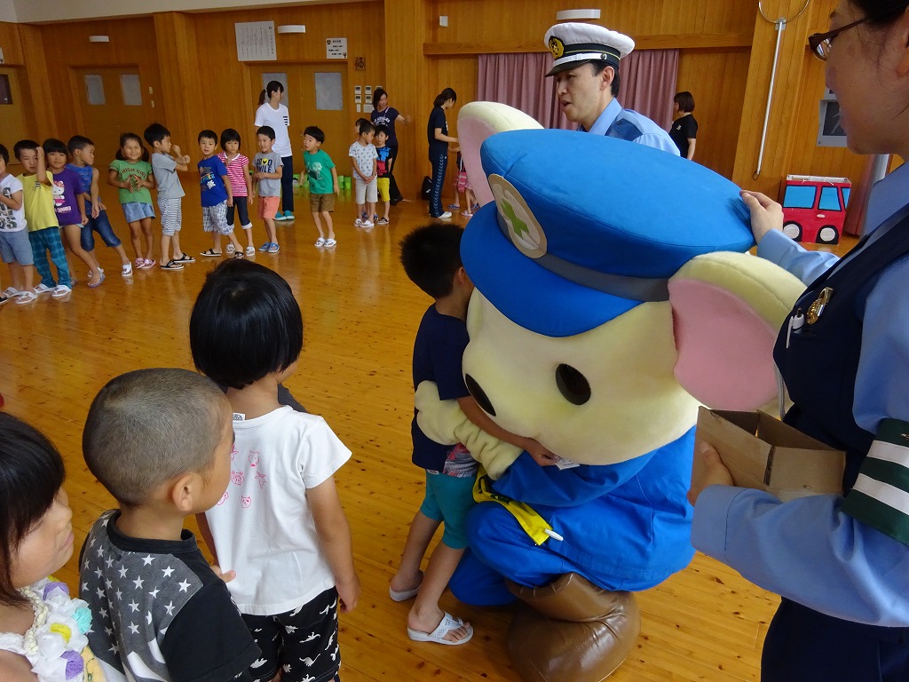 みんなが大好きなこあんちゃんとおまわりさんと一緒に交通ルールを確認し、横断歩道の正しい渡り方を教えてもらいました。