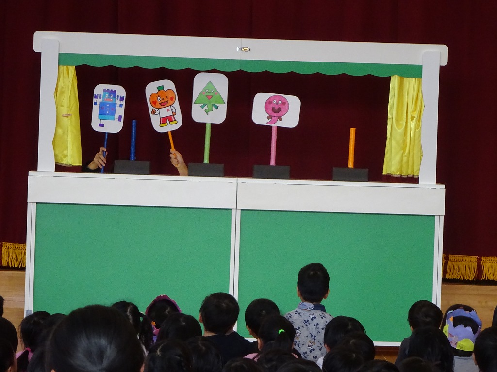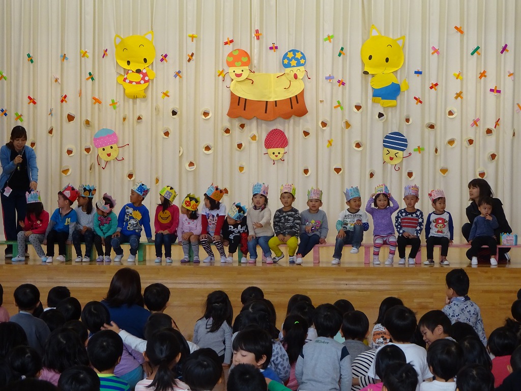 10月生まれのお友だちの誕生会が行われました。 ステージに立ち、どの子もとても嬉しそうにインタビューに答えて、ろうそくも上手に消すことができました。 少し緊張しながらも堂々とした子ども達でした。 お楽しみは、ハロウィンにちなんだペープサートで“○くん、△ちゃん、□くん”が魔法の言葉で、“こうもり、まじょ、フランケン”に大変身する姿に大盛り上がりで、楽しい誕生会になりました。