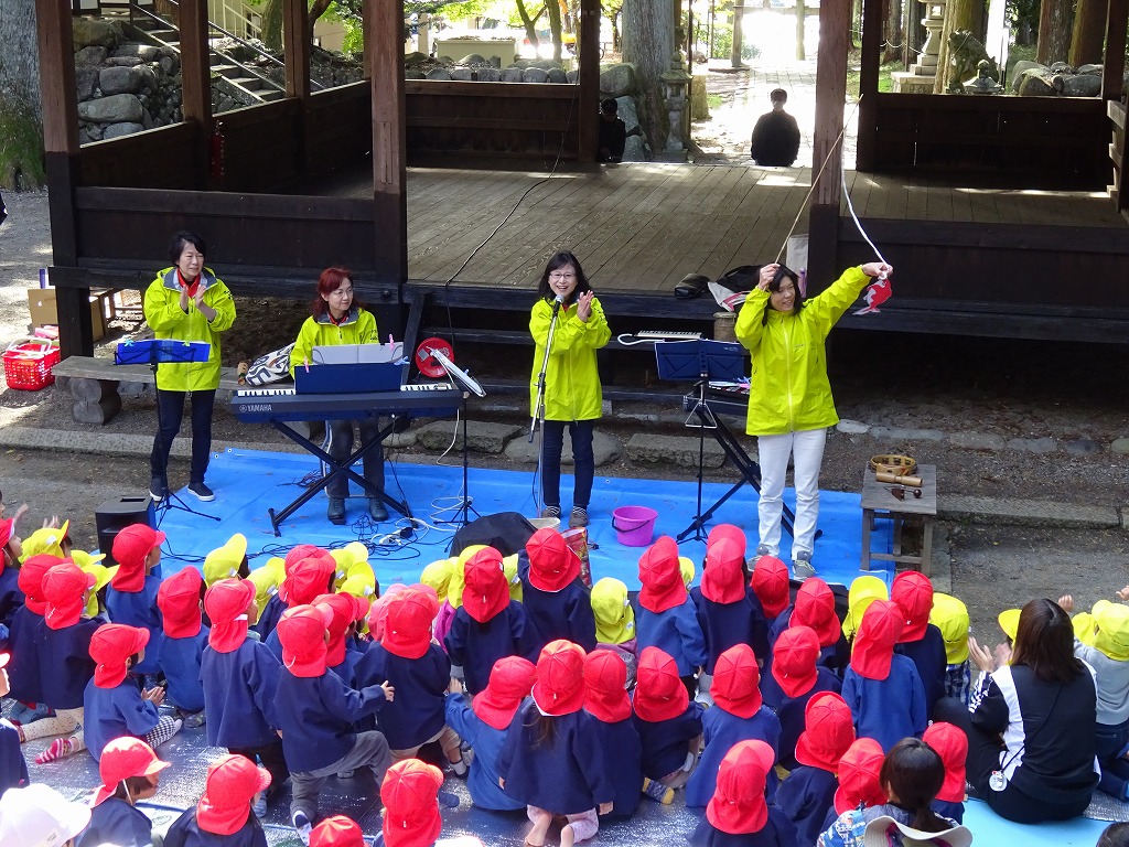 今年も諏訪神社で開かれた“鎮守の森のコンサート”を観に行きました。 今年も金山音楽振興会の4名の方がフルート、ギロ、ボンゴ、グロッケンなど普段あまり目にすることのない楽器を使って演奏してくださり「もみじ」などの季節の歌を歌って楽しみました。 また、魚釣りのペープサートで子ども達を盛り上げ、歌の楽しさを子ども達に伝えてくださいました。