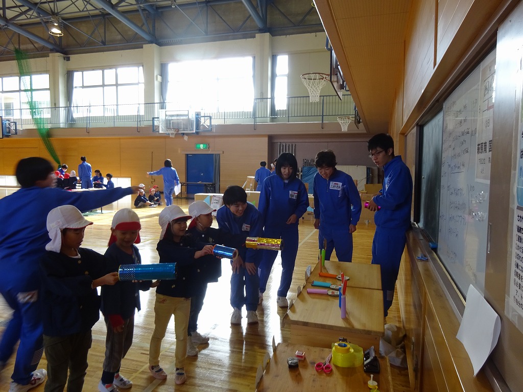 空気の力で的を倒す的当てやビー玉迷路、段ボール迷路、ボーリングなど中学生が丁寧にルールを教えてくれて、みんなとても楽しく遊ぶことができました。 小学校の次は中学生に行くというイメージが持てたようで、就学にもますます期待を持ったようでした。