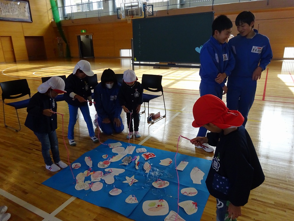 南中3年生の皆さんが幼児と触れ合う体験を通じて幼児の心身の発達に応じた遊びや関わりを工夫しましょうということで、年長さんが南中の体育館に出向き、3年生が企画してくれたたくさんの遊びやゲームに参加してきました。