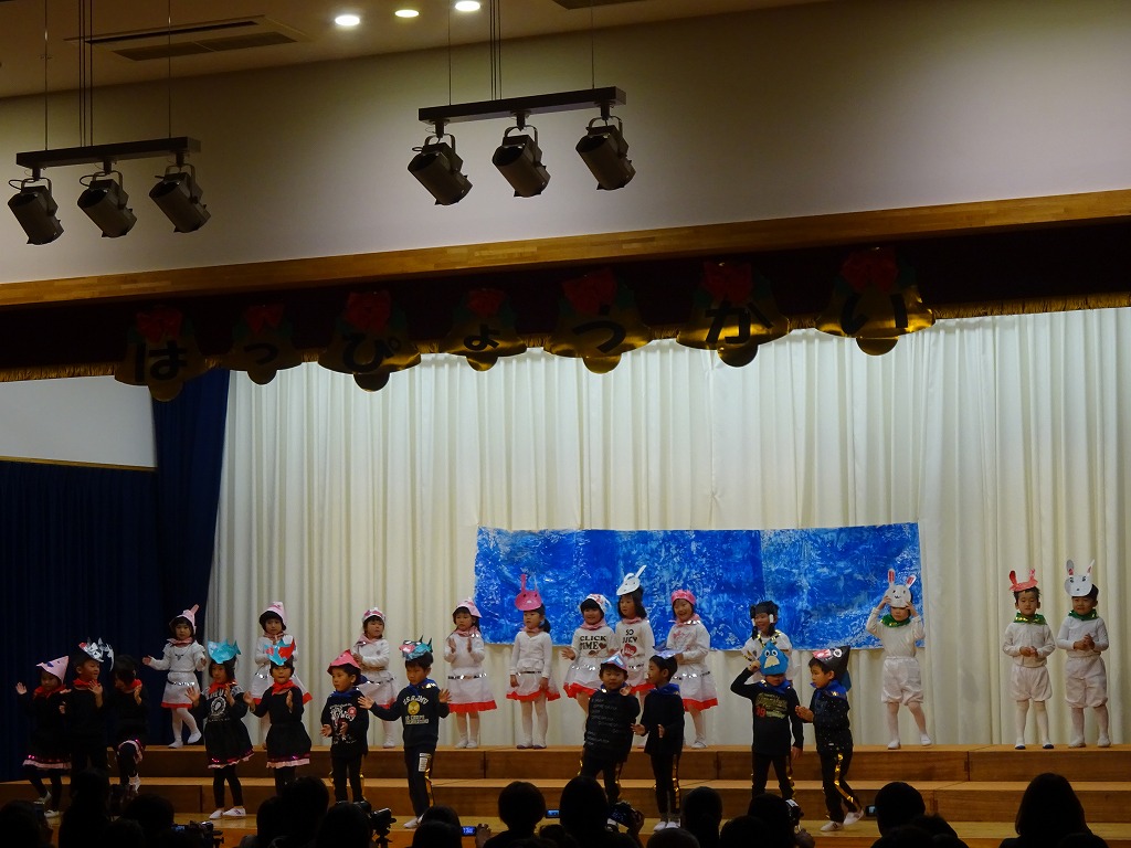 オペレッタに挑戦した年中さん。台詞、歌、踊りと張り切る姿がとても素敵でした。 昨年経験しているので、オペレッタができることがとてもうれしい様子がよくわかり、どの役でも完璧にこなす役者ぞろいでした。
