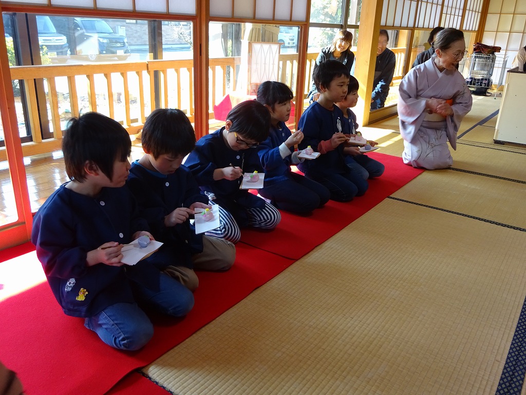お茶の先生から作法を教えていただいた後、和菓子が配られると手を床についてきちんと挨拶ができ、一口一口味わっていただいていました。