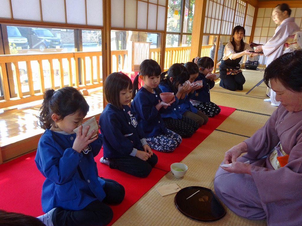 子ども達は少し緊張気味で入室しましたが、きれいな着物姿の方に温かく迎えていただき、和やかな雰囲気の中でおしとやかに正座をしていました。