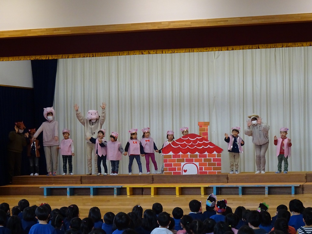今月は15名のお友だちが誕生日を迎えました。 3月生まれのお友だちは大きな声で堂々とインタビューに答えてくれました。 お楽しみでは、年長・年中の誕生児が保育士と一緒にオペレッタ「三びきのこぶた」に挑戦しました。 少し照れながらも楽しく、そして可愛く演じてくれました。