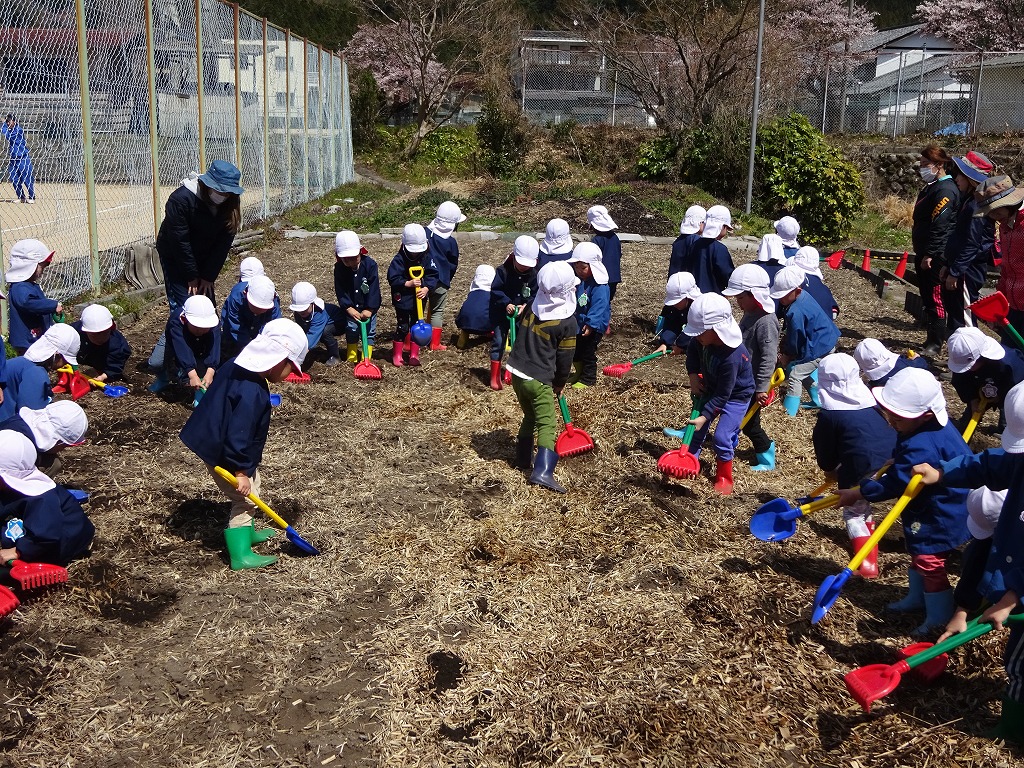 今年度も「土にふれ収穫する喜び・自然のすごさを体感する」を目標に農園活動がスタートしました。 農園開きは年長さん、年中さんで行いました。 年中さんはスコップで、年長さんは耕運機を運転させてもらい、畑の先生・都筑さんと一緒に畑を耕しました。