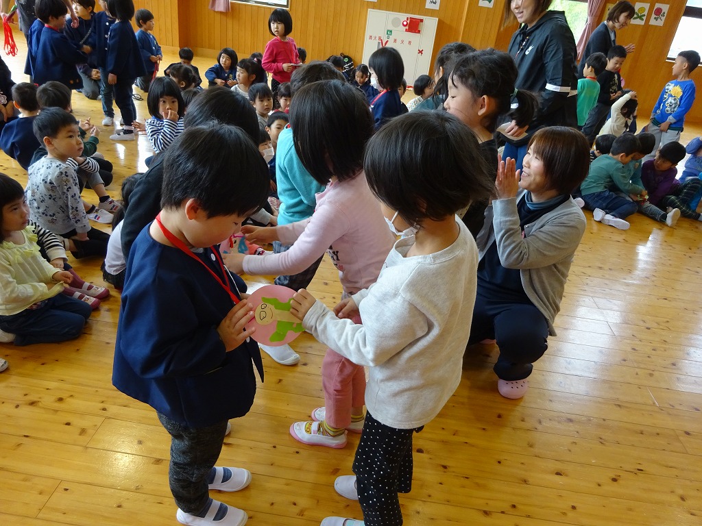 最後には、年長さんから、新しく入ったお友だち全員にメダルをプレゼント! 「一緒に遊ぼうね!」と声をかけてくれました。 みんなで仲良く楽しく過ごしていきたいです。