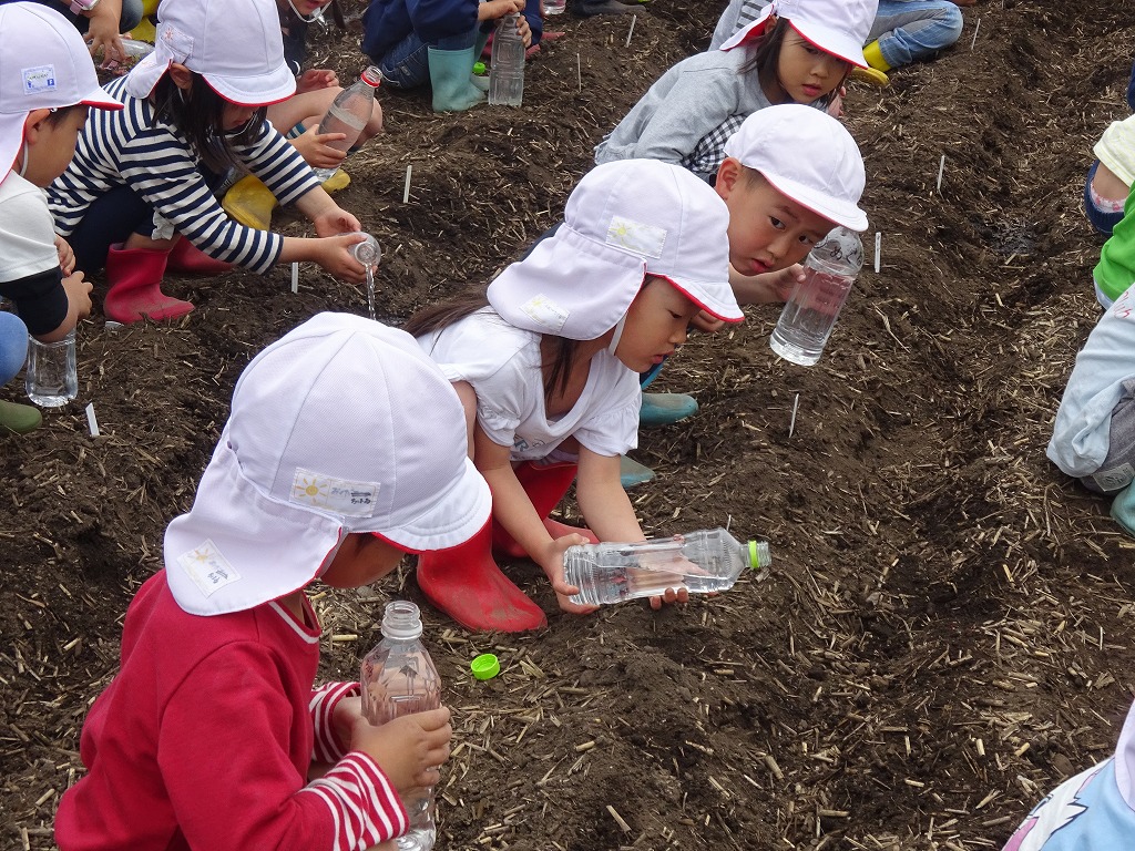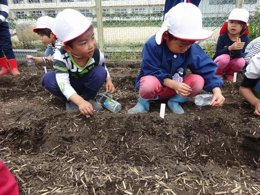 畑では、畑の先生から種の植え方を教わり、30㎝の間隔で種を置き、土の布団をかけ、仕上げに「大きくなあれ」と魔法の言葉をかけてからお水をたっぷりあげました。
