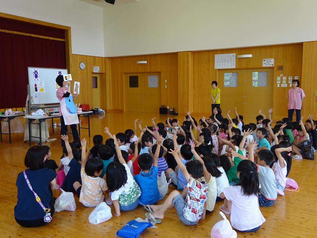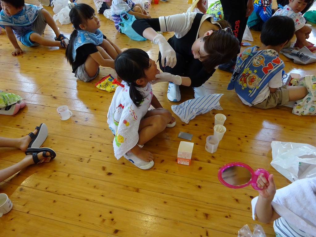 歯科衛生士さんが来園され、年長さんに歯磨き指導をしていただきました。 エプロンシアターやクイズなどで、正しい歯の磨き方や虫歯になりやすい食べ物について話を聞きました。