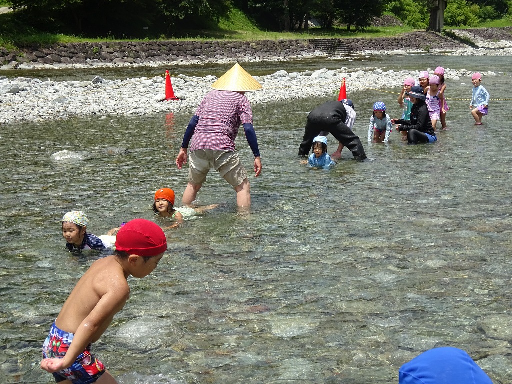 最初は川に入るのを怖がっていた子もいましたが、友だちや保育士と手をつないで入ることから始め、