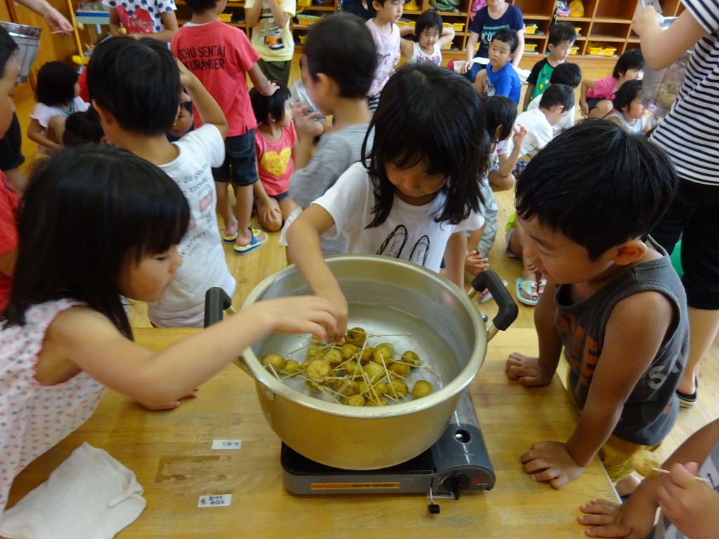 大きなスポンジでゴシゴシと洗い、保育士と一緒に竹串にさして鍋に投入。