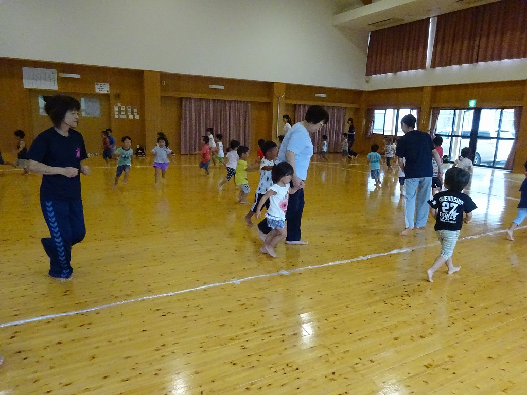 年少さんが、2回目のリトミックに参加しました。 曲の聞き分けでは、 すみれ組:かえるのうた、もも組:どんぐりころころ、きく組:とんぼのめがね の3曲に分かれ、自分のクラスの曲がピアノで弾かれたときだけ走ることができるという活動を行いました。