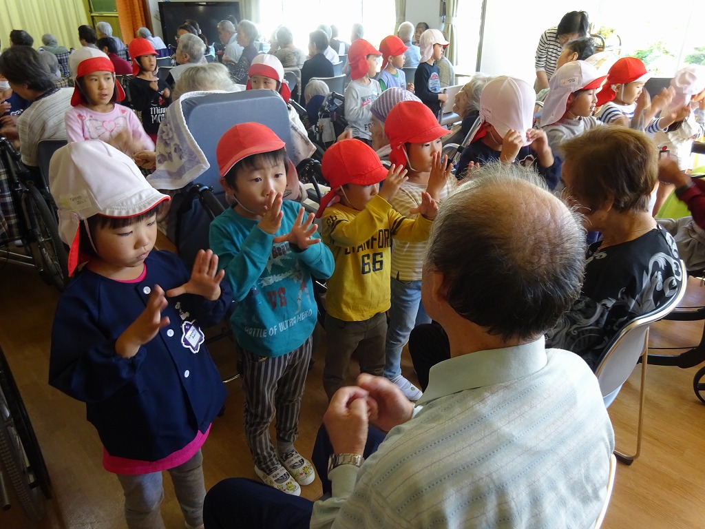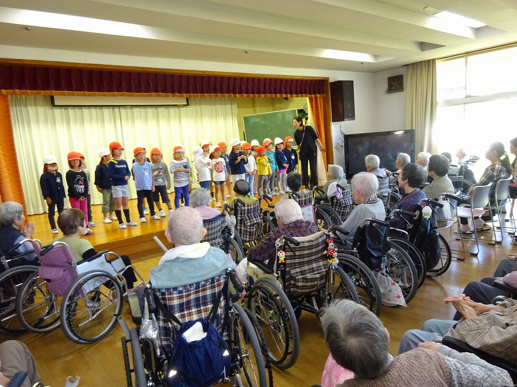 秋らしい心地よい気候の中、歩いてサニーランドへ訪問に出掛けました。 サニーランドでは、大勢の方に迎えていただき、少し緊張気味の子ども達でしたが、 運動会の遊戯や「とんぼのめがね」を堂々と披露し、喜んでもらえたことがとても嬉しかったようでした。