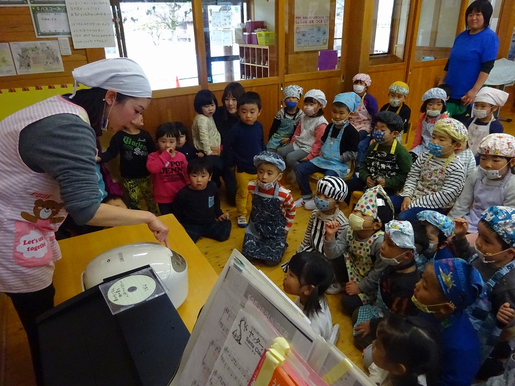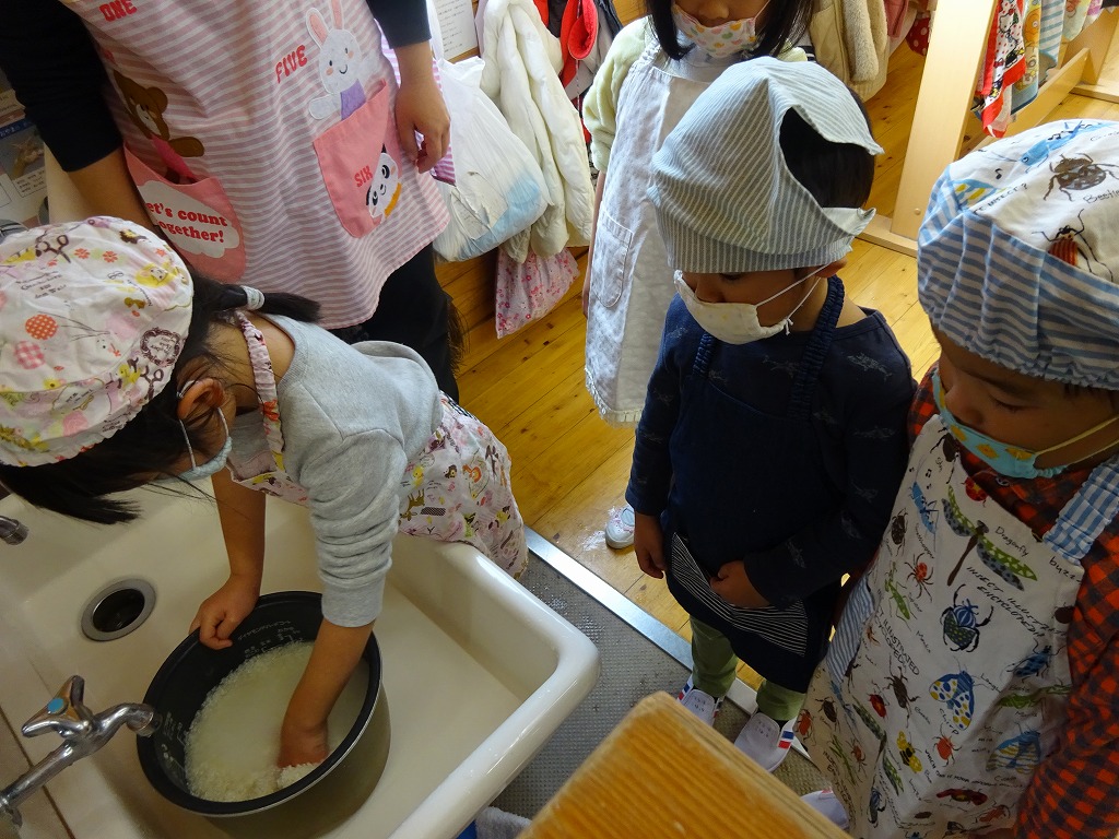 年長さん、年中さんはお米を一人ずつ洗い、クラスでご飯を炊きました。