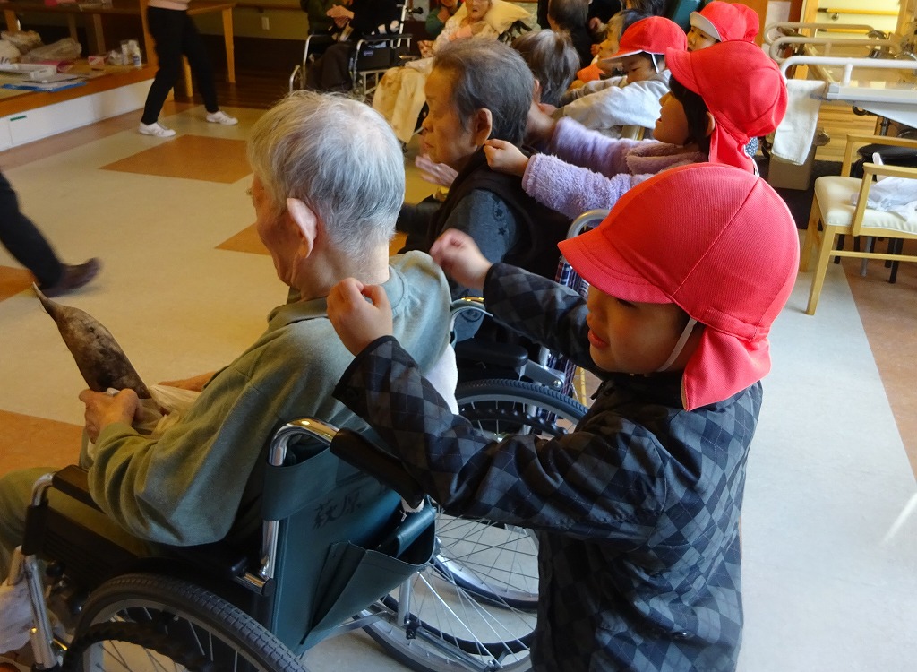 大根も直接渡すことができ、触れ合うだけでなく、たくさん話をすることができました。 おじいちゃんおばあちゃんの歳を聞いて、「すごーい!」とビックリする子ども達! 温かい雰囲気の中で、楽しいひと時を過ごすことができました。