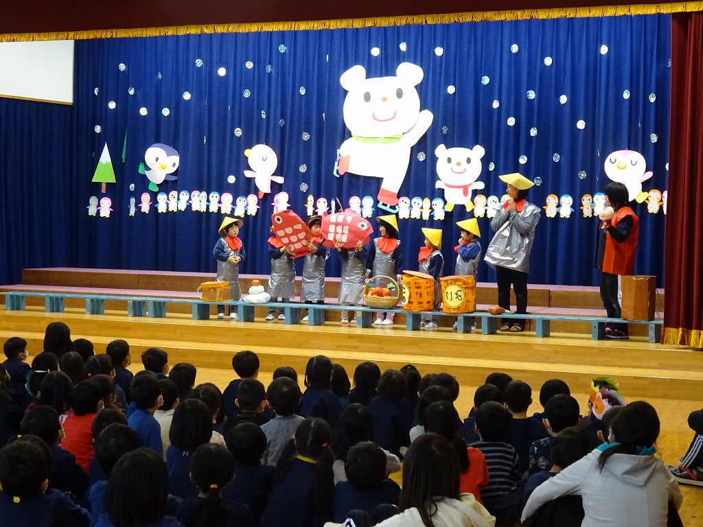 今月のお楽しみは、“かさじぞう”の劇でした。 お地蔵さんをよく見てみると… お地蔵さんは12月生まれの年長さん!とても上手に演じてくれました。 12月生まれのお友だち、お誕生日おめでとう!!