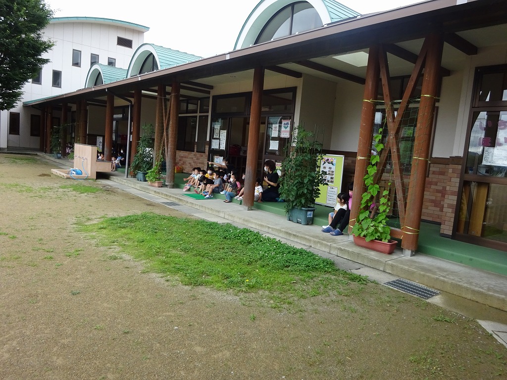 未満児さん・年少さんはテラスから避難の様子や、保育士がサスマタを使って不審者に向かうところを真剣に見てくれていました。