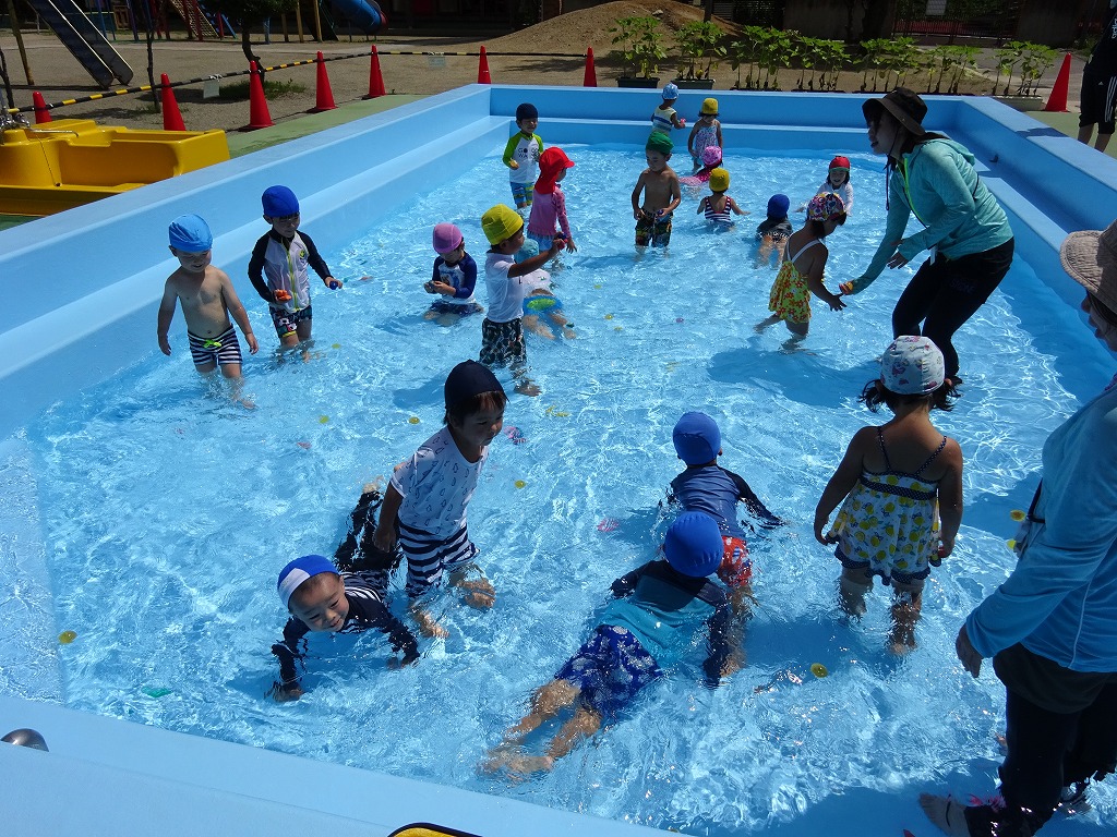 新型コロナウィルス対策のため、赤と白の2チームに分けて交代で入りました。 初めて入るこども園のプールに、「大きい〜」と目を輝かせる子ども達♪ 楽しく遊ぶための約束を聞いてから、少しずつ体を水を慣らして水に入りました。 少しの時間でしたが、初めてのプールを楽しむことができ、次回のプール遊びに期待が膨らみます。