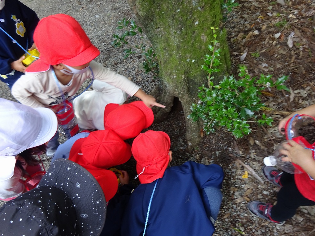 お散歩先の諏訪神社では、どんぐりやくぬぎ、杉の実などを見つけ、秋の自然に触れながら楽しむことができました。 子ども達の虫かごは、秋の葉っぱや実でいっぱいになり、たくさんのお土産を持って帰ってきました♪