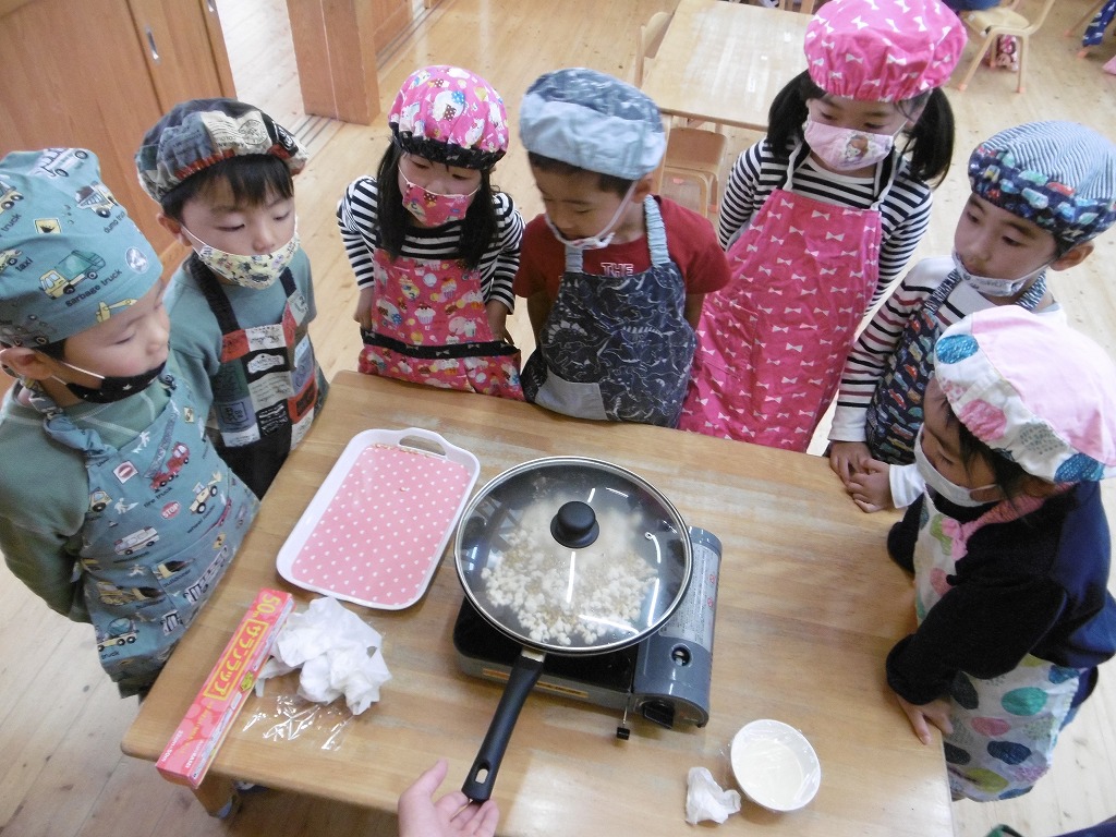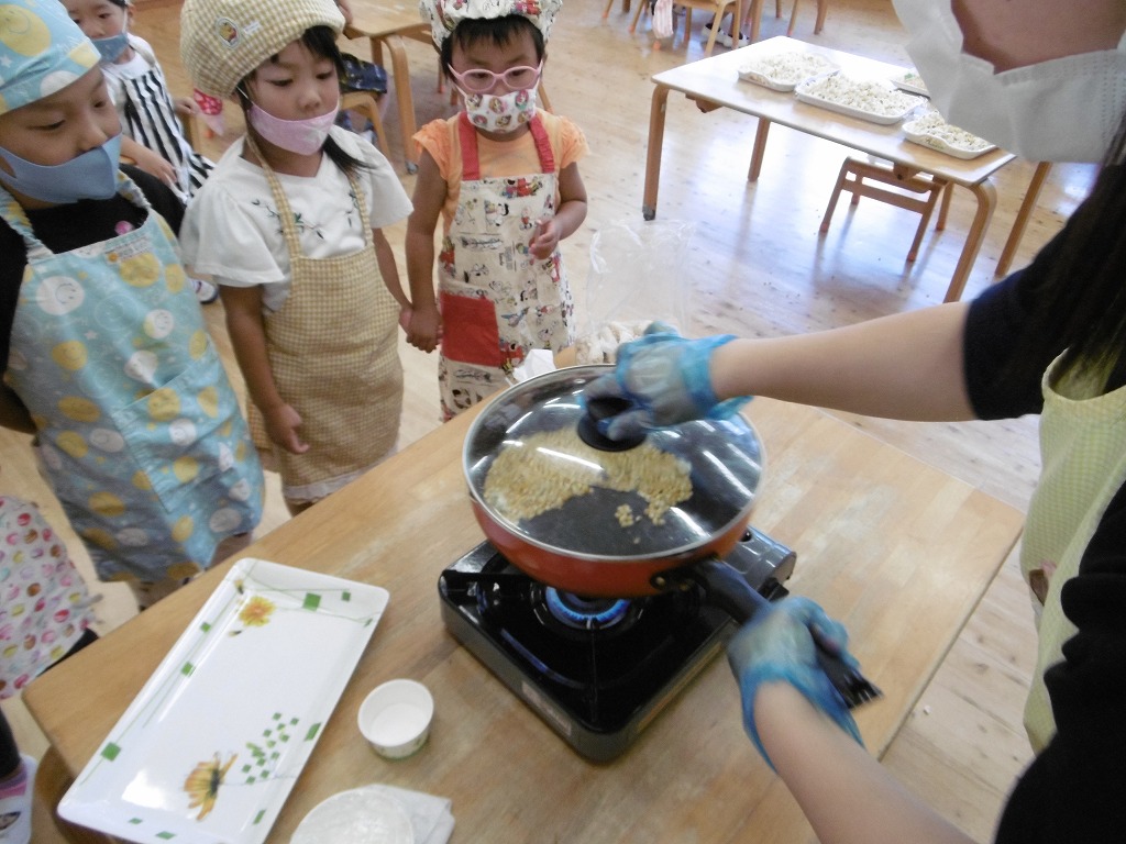 一粒はじめたのをスタートに、どんどんはじけだし、「やったー!」「ポンポンいっとる!」「いいにおい!」と楽しそうな様子でした。