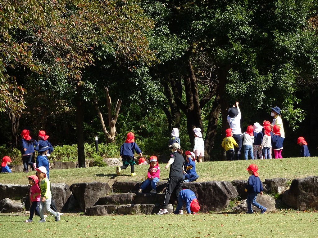 友だちと手をつないで、花壇の花や色づいた木々の落葉、木の実などを発見したり、誰かが口ずさんだ歌を大合唱したり、気分上々でした。