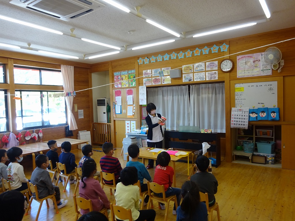 何かできないかと工夫していただき、歯の染め出し、磨き残しのチェック、仕上げ磨きは中止し、エプロンシアターで歯磨きの大切さ、歯の模型で歯磨きの仕方を教えてもらいました。