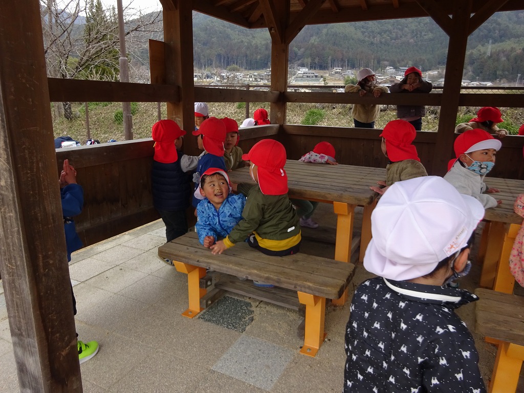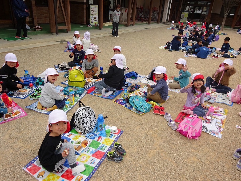 次の目的地は、「松ヶ瀬公園」 道端には梅の花やたんぽぽがきれいに咲いていて、春の訪れを感じることができました。 公園でいっぱい遊んだ後は、お弁当を楽しみに園へ戻りました。 園庭にシートを広げ、ゆっくり味わうことができました。 1年を振り返る楽しいお散歩になりました。