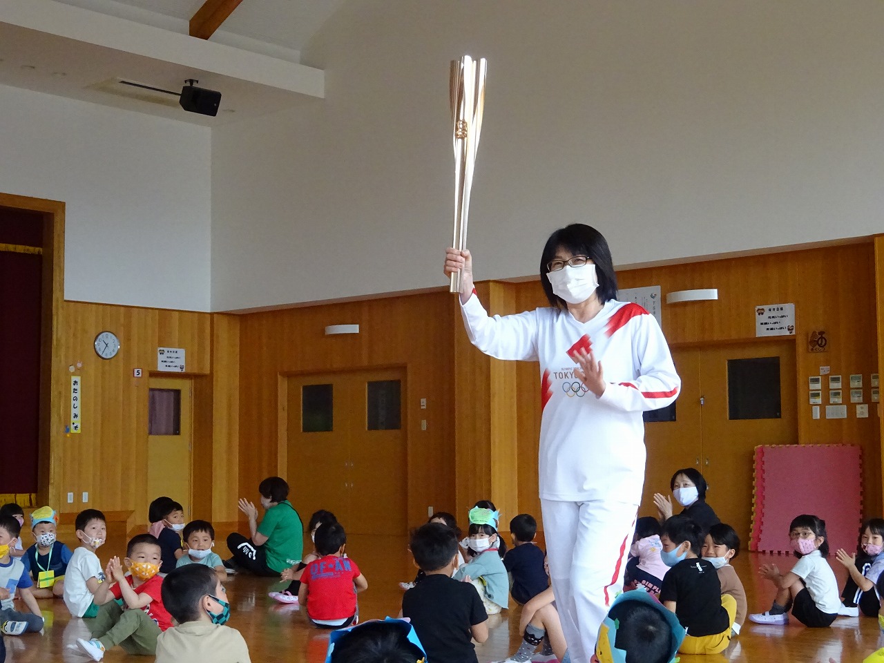 最後に、実際に聖火リレーに参加した保育士がトーチを持って登場!