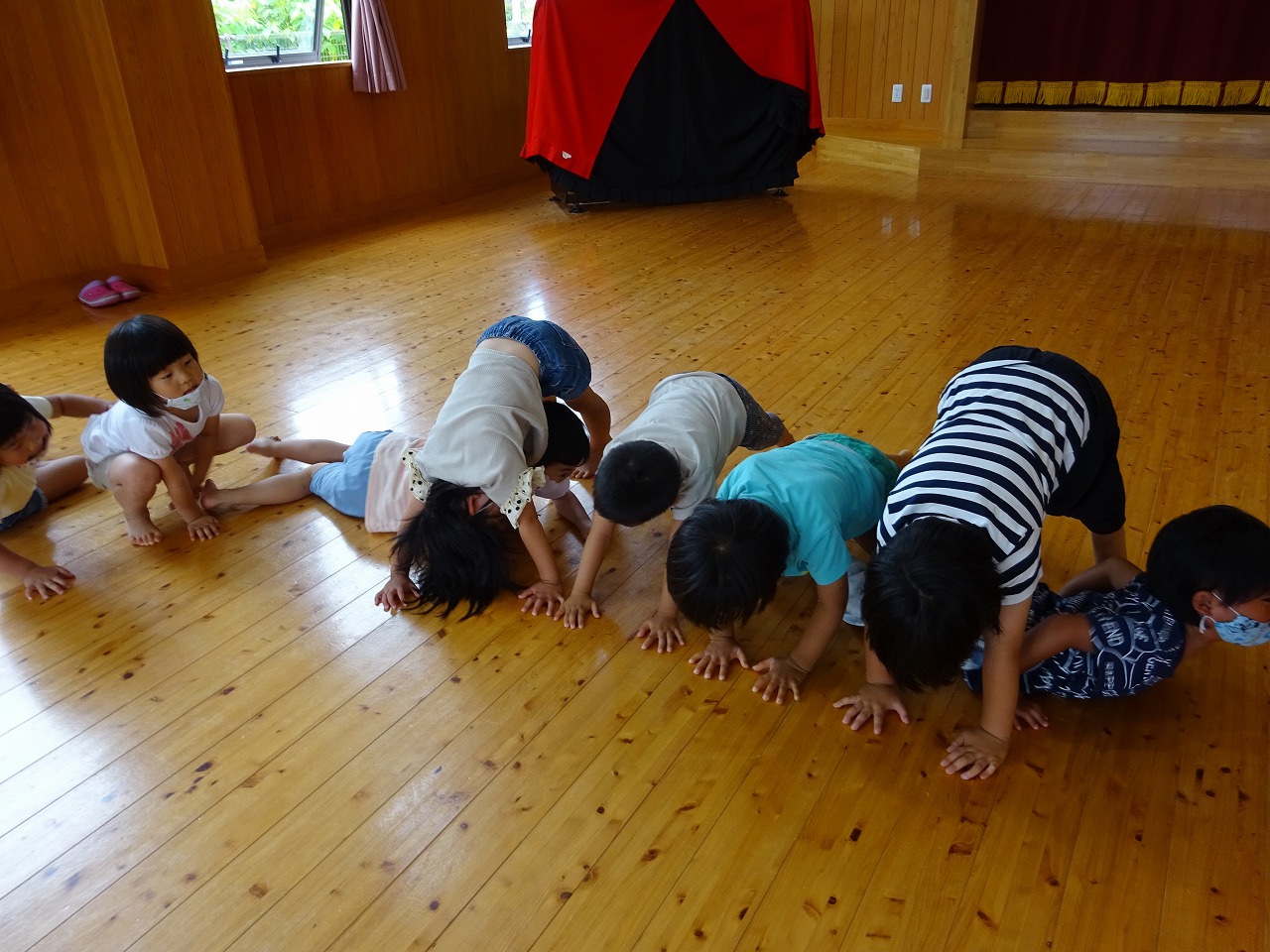 その他にも、ペアでじゃんけんをして、負けた子が勝った子の足のトンネルを“へび”になってくぐりました。どんどん長くなっていくトンネルを一生懸命通る姿が、とっても可愛かったです。