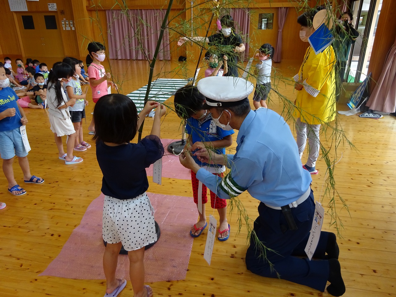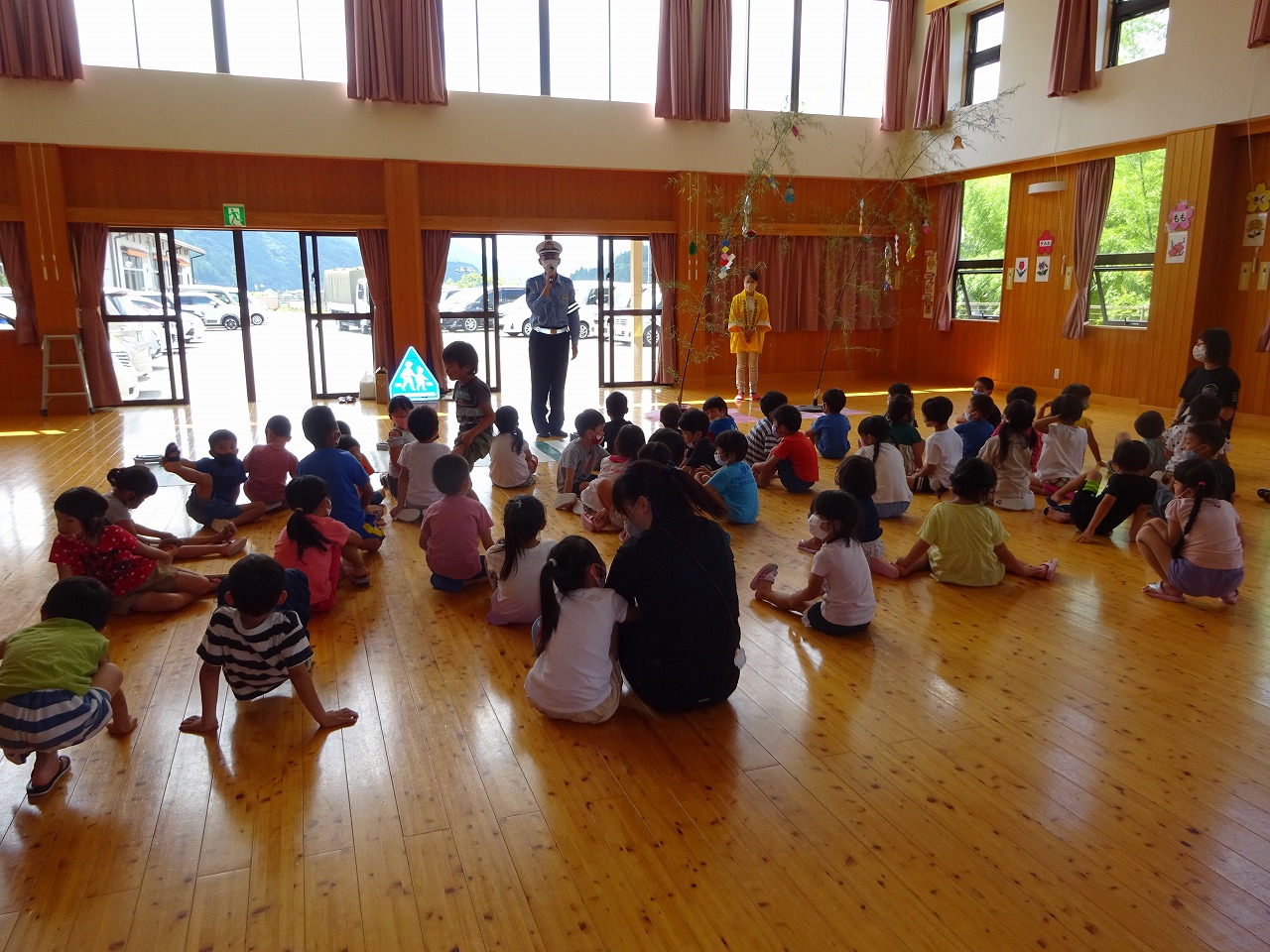 七夕交通安全教室に年長さんが参加しました。 遊戯室には七夕飾りが飾られ、横断歩道も設置させていて、いつもと違う雰囲気に少し緊張した様子でした。 初めに、警察官の方のサプライズで、かっこいい白バイを見せていただきました。 緊張もすっかりほどけ、笑顔いっぱいの年長さんでした。
