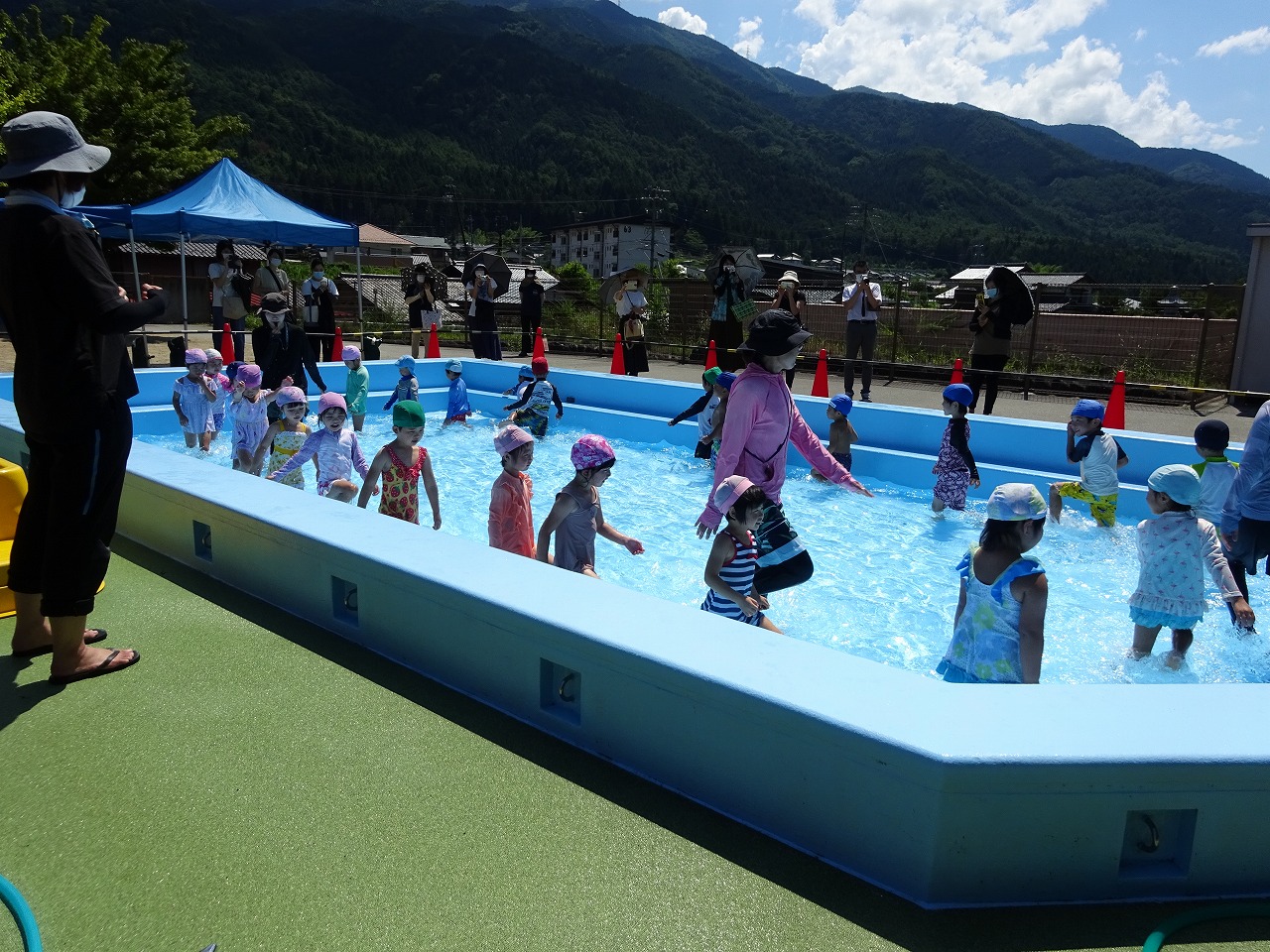 子ども達は、少し緊張しながらも、お家の方が見に来てくれることを楽しみにしていました。 年中さんになり、フープくぐりやワニ泳ぎ、顔付けなど、去年よりできるようになったことが増えました。 「見て見て〜!」と、体全体で水遊びを楽しみ、自信をもって取り組む姿を観てもらうことができました。 暑い中、参観いただきありがとうございました。