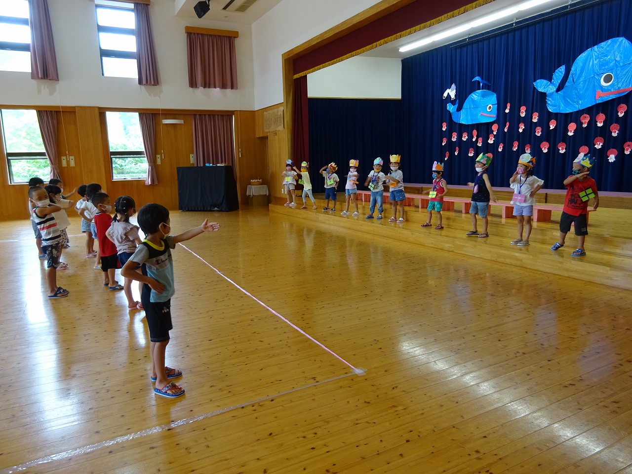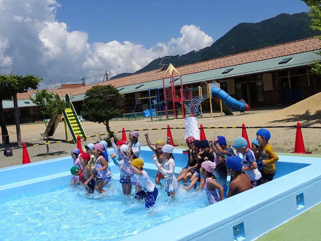 「プールで〇×クイズ」が今月のお楽しみでした。 「アンパンマンの中身はチョコレートである」「みんなが飲んでいる牛乳を出しているのは馬である」 など、楽しい問題にキャーキャー盛り上がる子ども達でした。 ワニ歩きや泳いで移動する子もいて、夏ならでは楽しい思い出がまた一つふえました。 7月生まれのお友だち、お誕生日おめでとう!