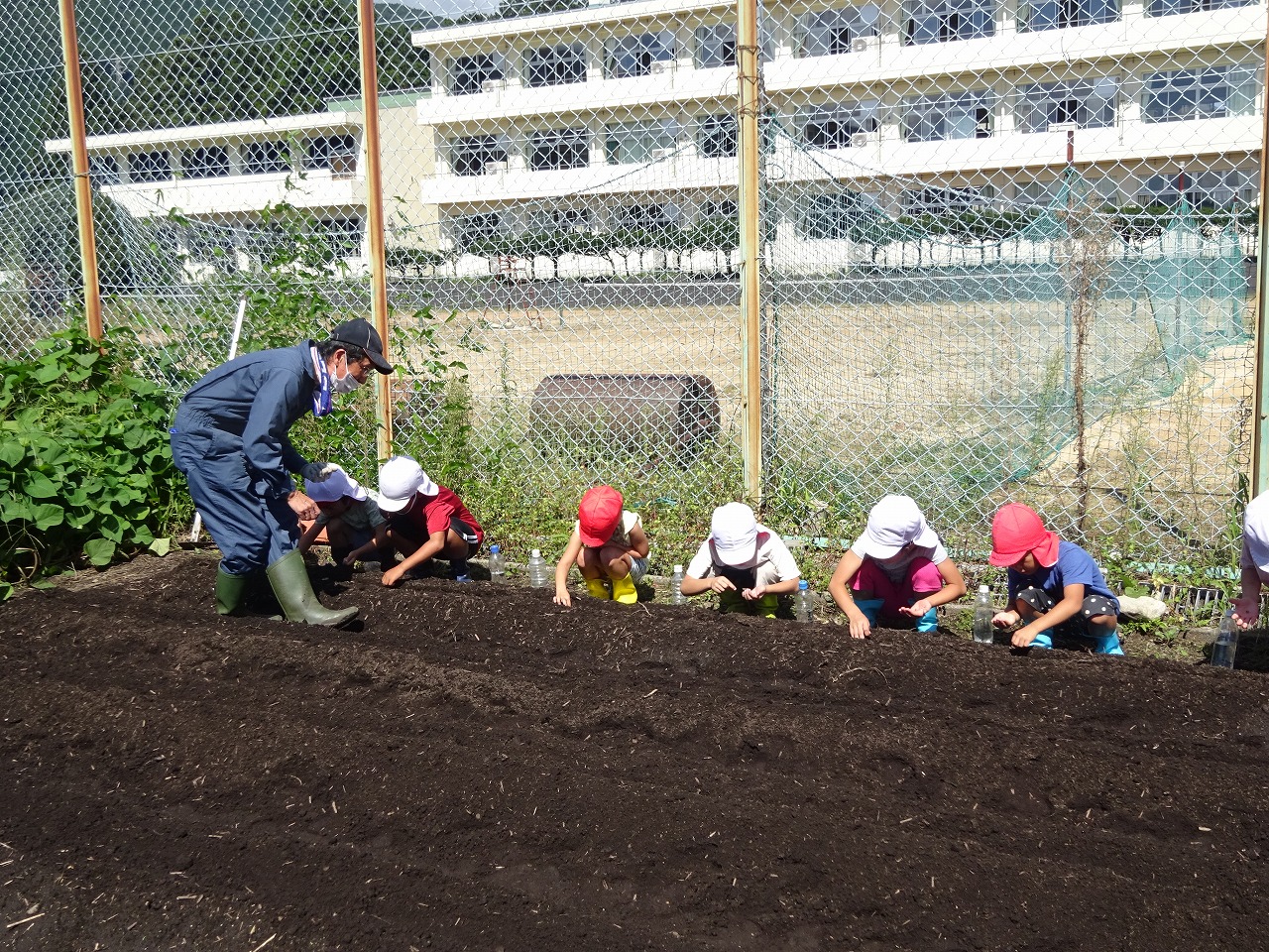 未満児さんは、お兄さんお姉さんが種をまく様子を見学し、その後、こあら組さんも種まきを体験しました。