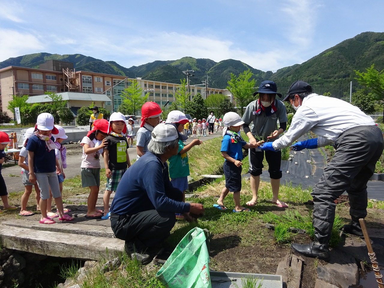 今日は、年長さんが田植えの体験をさせていただきました。 田んぼの先生に苗をもらって、田んぼの中に入りました。 泥の中に恐る恐る足を入れる子、「気持ちいい」と喜んで入る子、反応は様々でした。