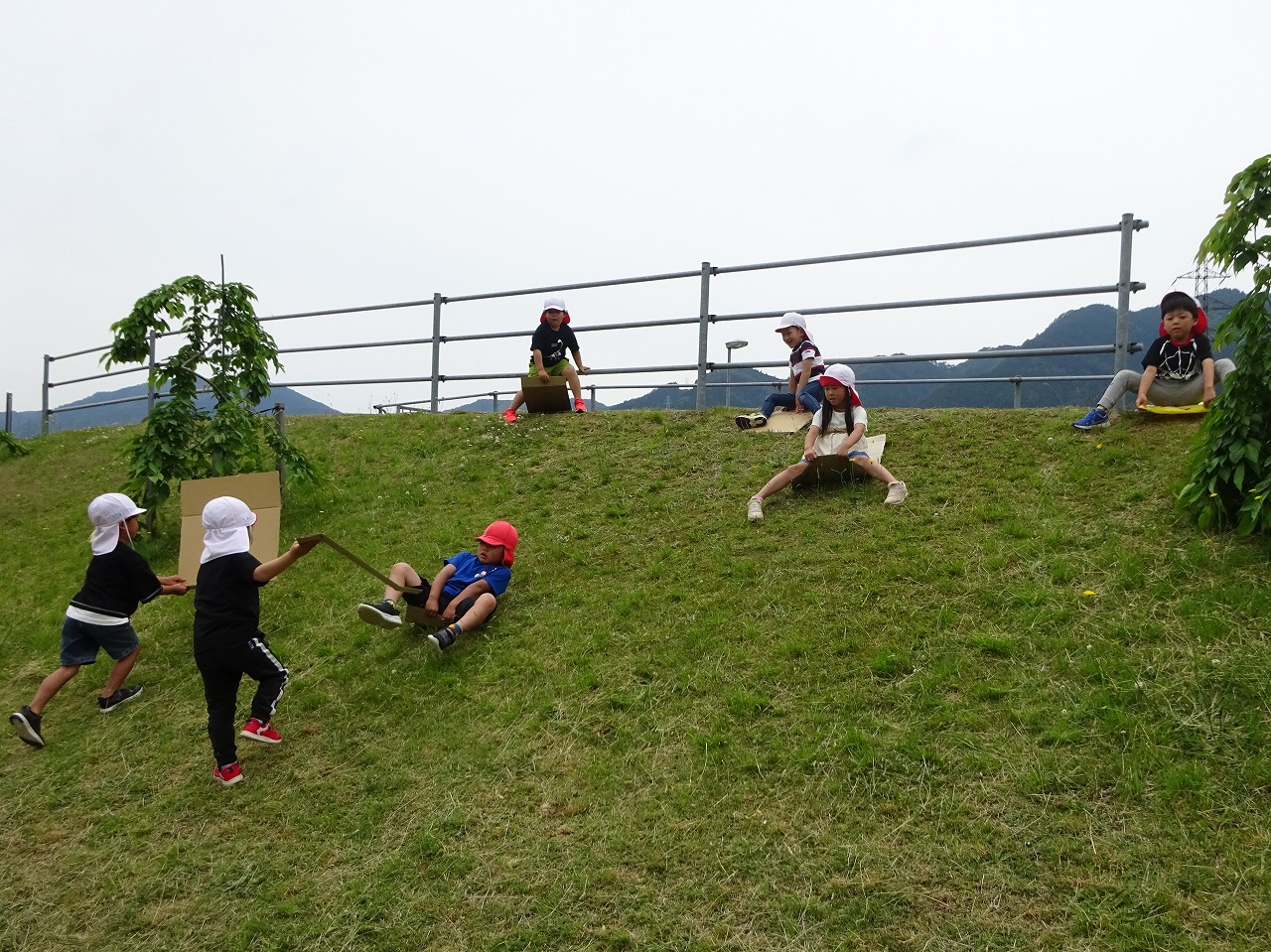 楽しみにしていたお弁当をペロリと完食し、午後からは段ボールをそりにして芝生滑りや、遊具を全力で楽しみました。 お天気にも恵まれ、とっても楽しい遠足となりました。