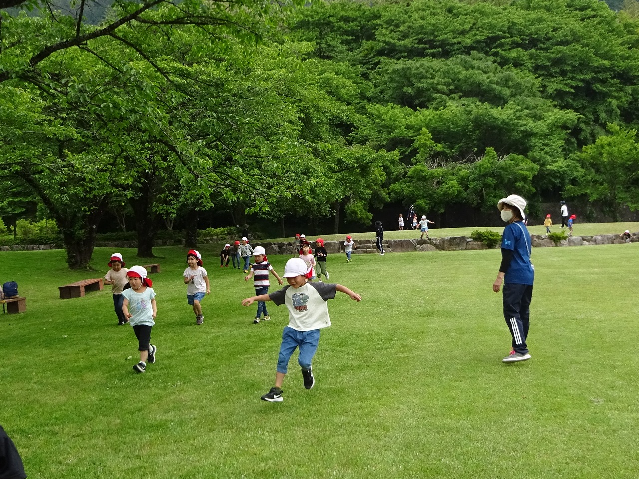 今日は、みんなが楽しみにしていた遠足に行ってきました。 年長さんは、飛騨川公園まで歩き、バスに乗って帰ってきました。 普段のお散歩よりも長い距離を歩きましたが、公園でたくさん走ったり、芝生を転がったり、疲れ知らずの子ども達でした。
