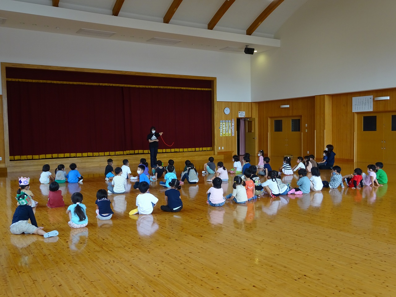 今月のお楽しみは、「マジックショー」でした。 グニャグニャの紐がピンッとなったり、ステッキからお花が出てきたり… 子ども達は、「うわ〜!!」と目を輝かせていました。 9月生まれのお友だち、お誕生日おめでとう!!