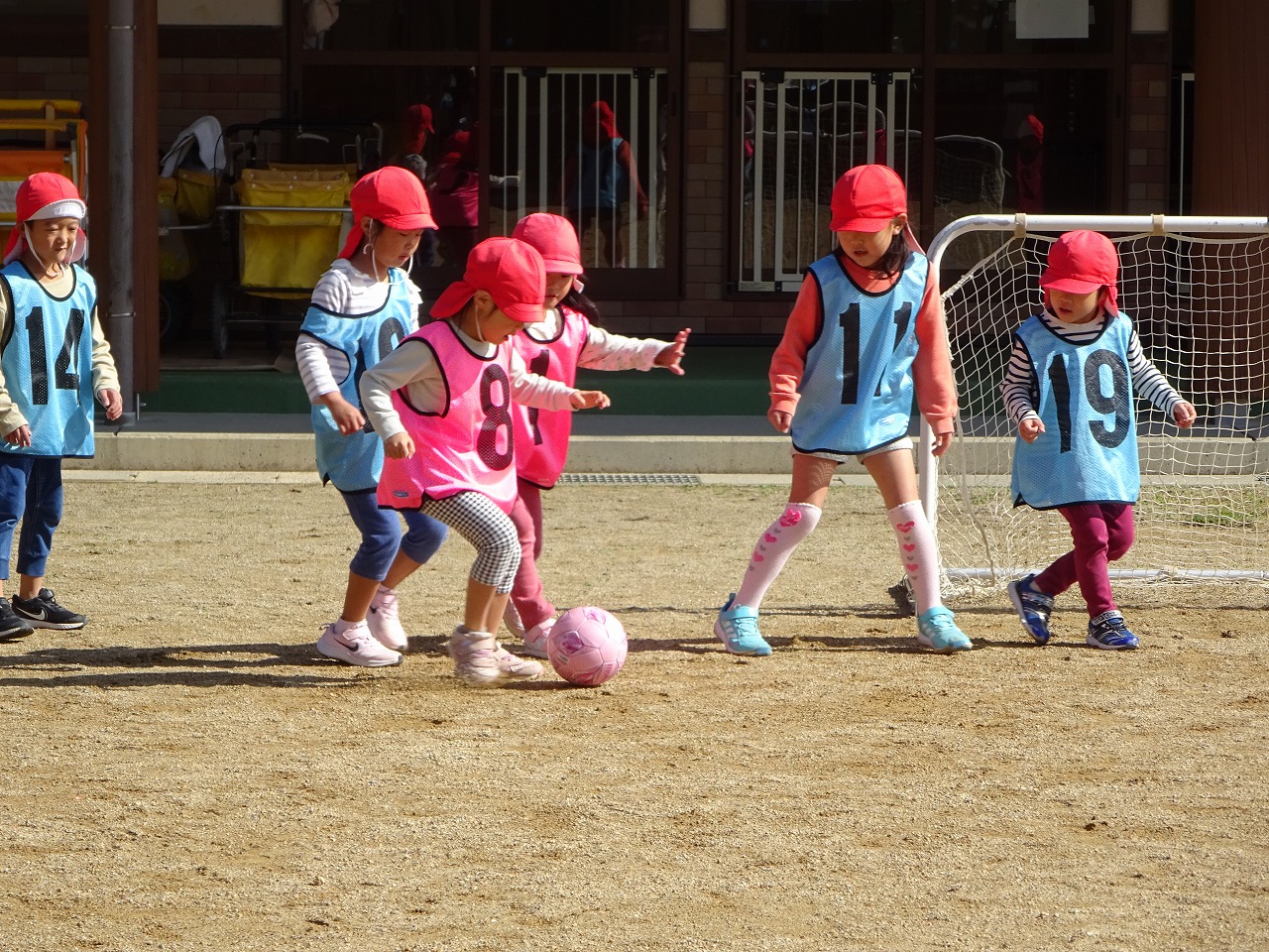 今日は、年長さんが5回目のサッカー教室に参加しました。 5回目ということで、ルールをよく理解し、みんなでボールを一生懸命追いかけていました。 ゴールもたくさん決まるようになりました。
