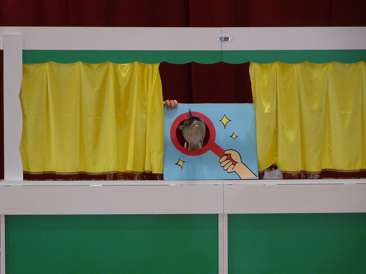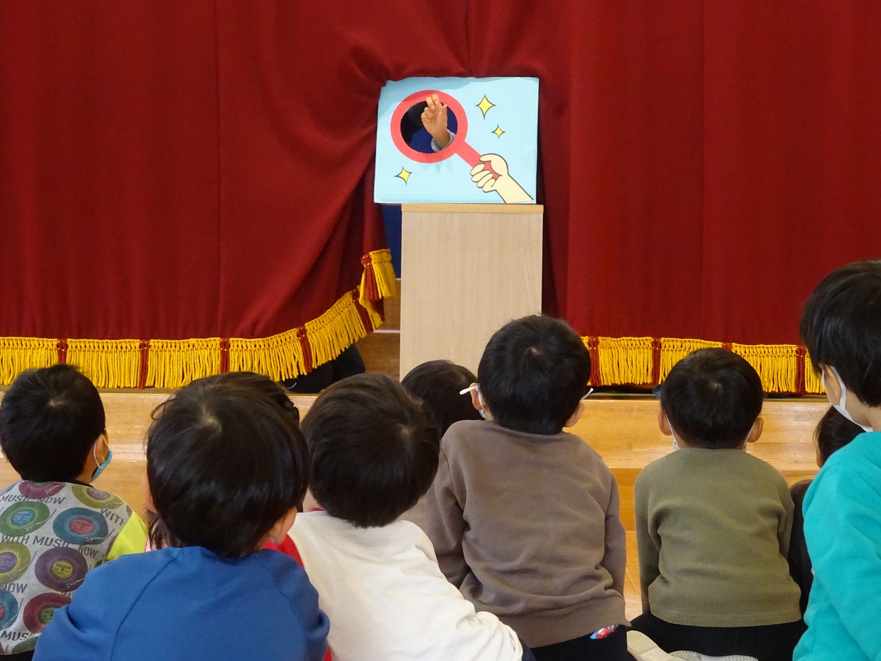 今月のお楽しみは、「これ、なぁ〜んだ」でした。 大きな虫眼鏡のあなから、リアルな動物や先生が見えると、大興奮で回答してくれました。 とても盛り上がり、楽しい誕生会となりました。 11月生まれのお友だち、お誕生日おめでとう!!