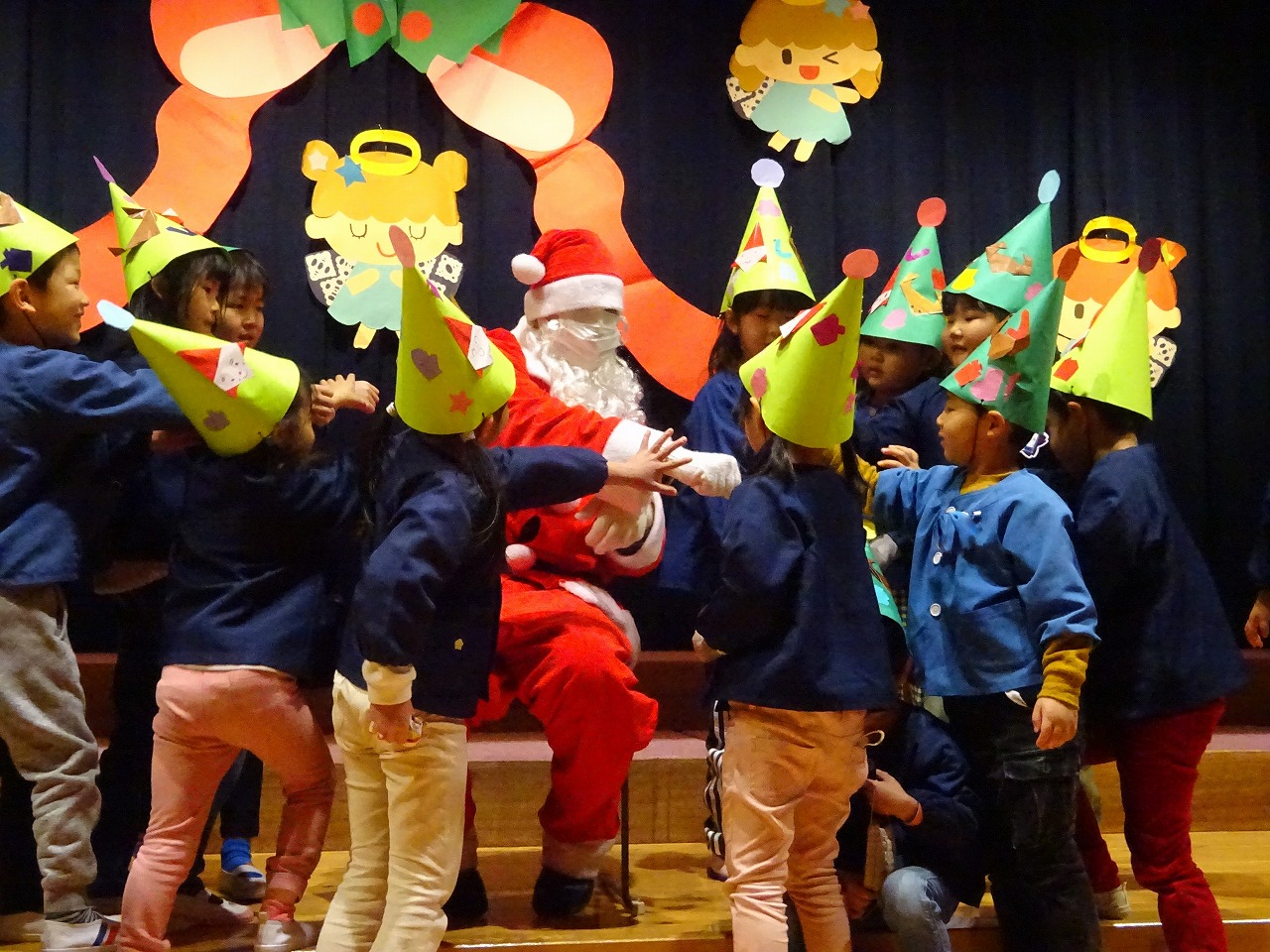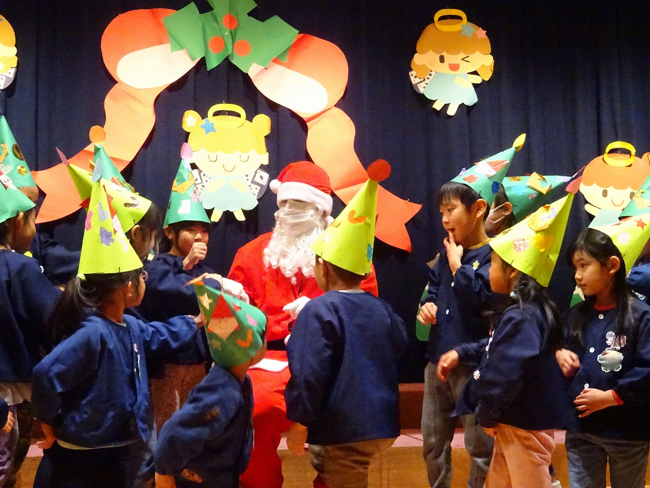 手作りの帽子をかぶって遊戯室に入ると、薄暗い雰囲気にワクワク! 遠くから鈴の音がしてサンタさんが登場すると・・・ 「わぁ〜!」と目をキラキラさせていました。 サンタさんに質問に答えてもらった後は、一番のお楽しみのプレゼントをもらい、写真も一緒に撮ってもらいました。 「センキュー!!」と英語でお礼を言う子ども達。素敵な思い出ができました。