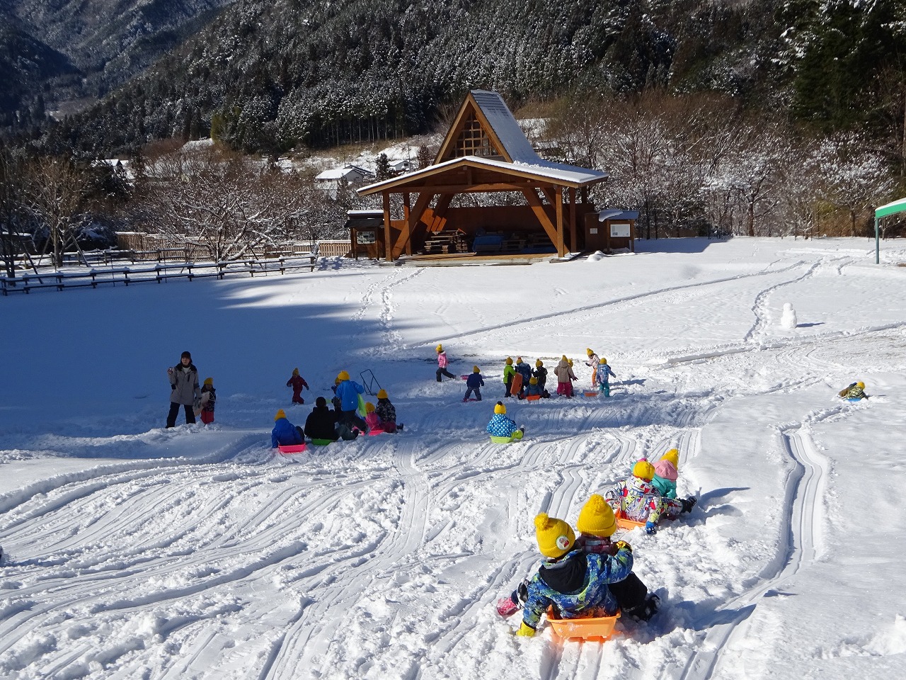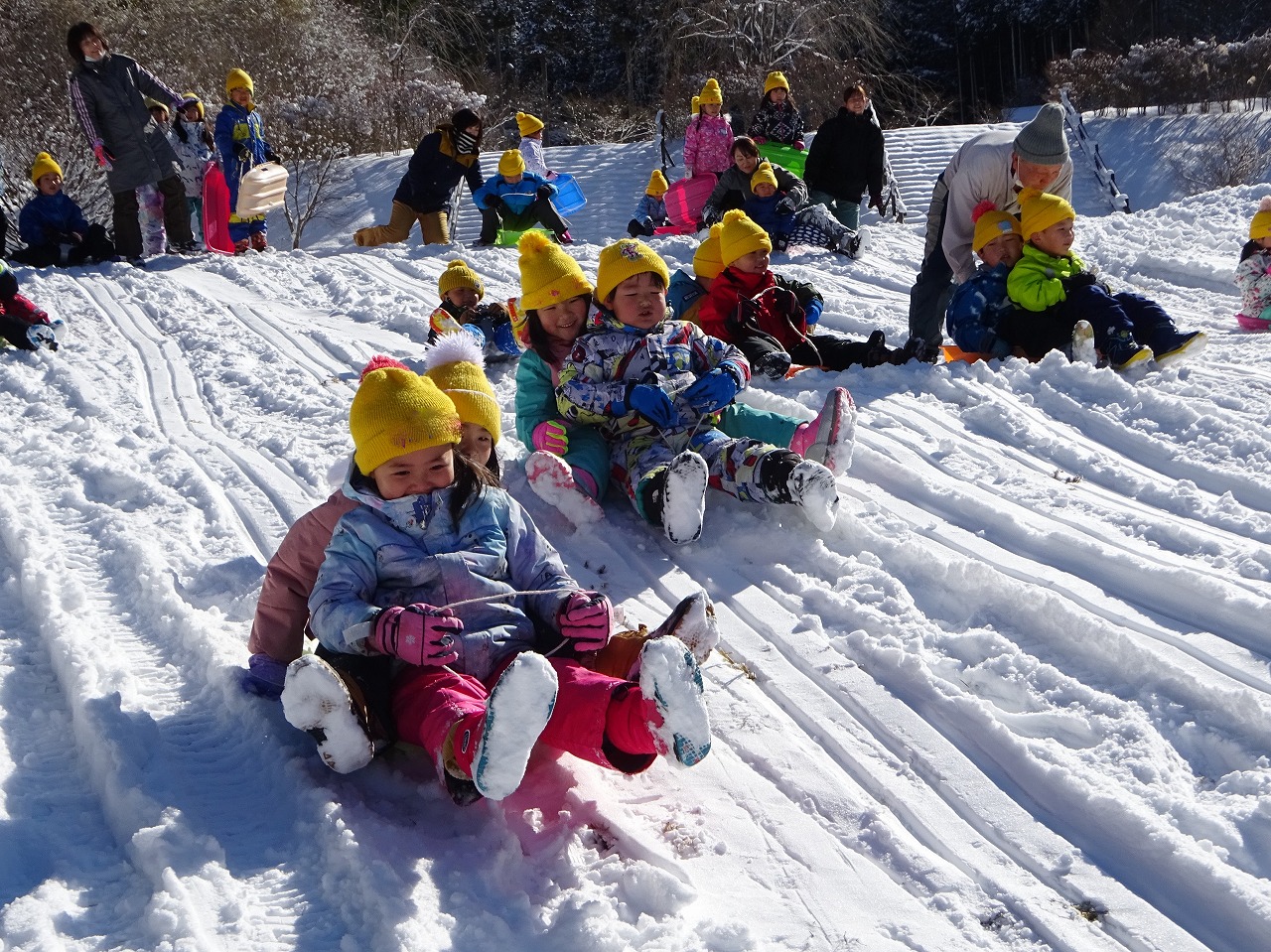 子ども達が滑りやすいように、NPO理事が斜面を整えて待っていてくれました。 長い斜面を勢いよく滑り、「キャ〜!!」と大歓声が上がりました。 1人で滑ってみたり、友だちと、先生と、何回も滑って大満足の様子でした。 冬の自然の中で思い切り遊ぶ、楽しい体験でした。