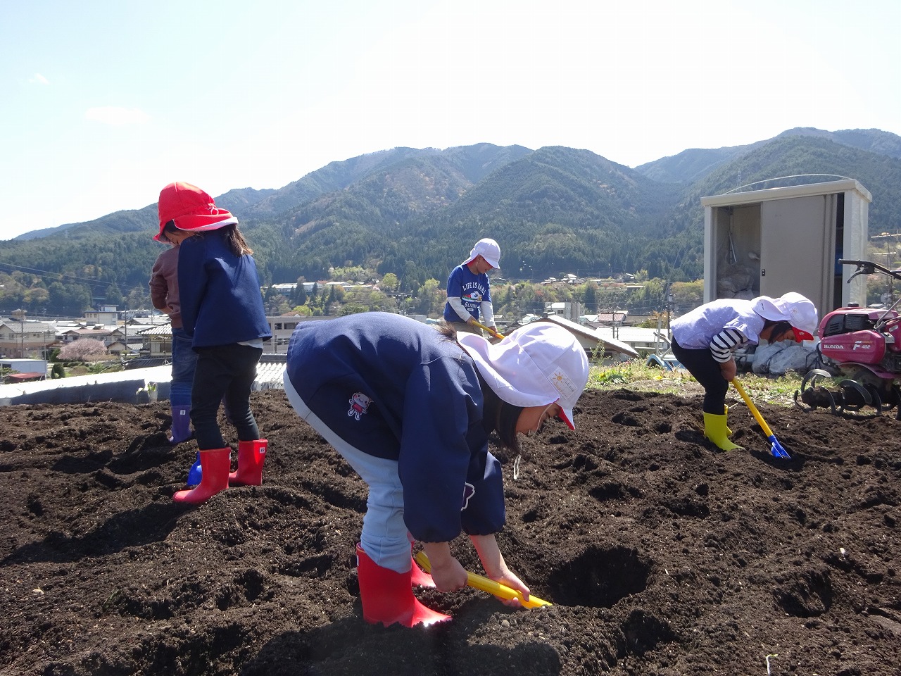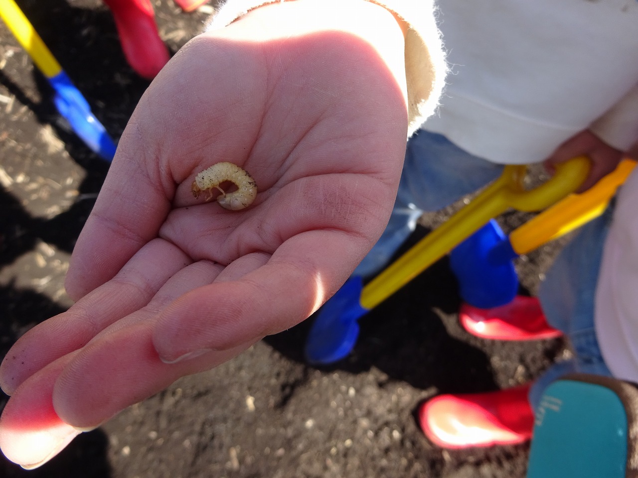 その後は、みんなでスコップを使って仕上げをしました。 大きな穴を掘ったり、山を作ってみたり、幼虫を見つけたり・・・ 土に触れながら、楽しく農園開きを行い、うれしそうな子ども達でした。