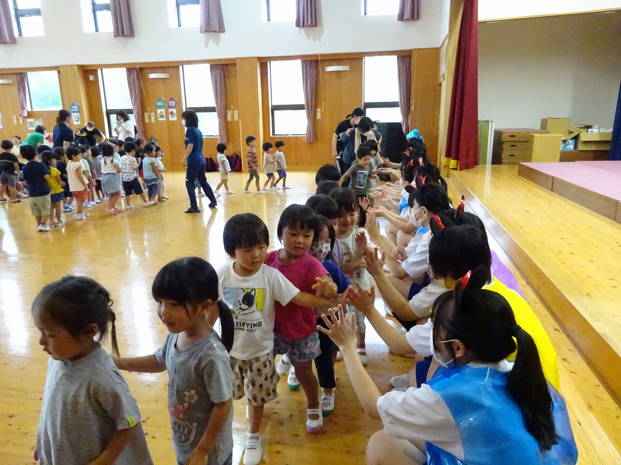 今月のお楽しみは、益田清風高校から実習に来てくれるお兄さんお姉さんが、 「ハンドベルとジャンボリミッキー体操」を披露してくれました。 大盛り上がりの誕生会でした。 9月生まれのお友だち、お誕生日おめでとう!!