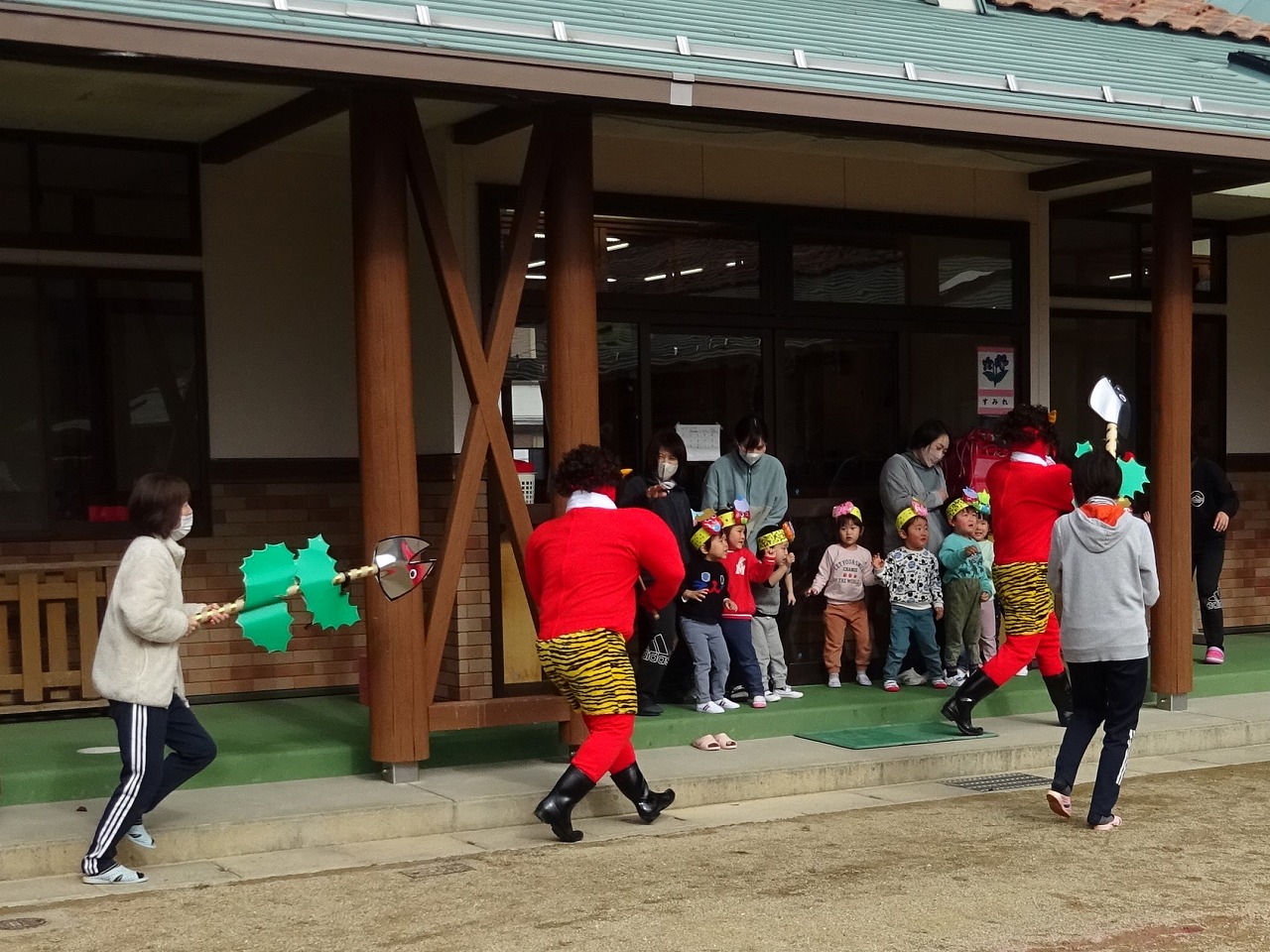 すると、そこへ!本物の鬼が登場!不意を打たれてビックリ仰天しましたが、 「鬼は外!」「福は内!」と大きな掛け声で、鬼に向かって果敢に豆を投げていました。 最後は、園長先生と副園長先生がイワシと柊の葉で鬼を追い払い、鬼は山へと帰っていきました。 一つ逞しくなった子ども達。春はもうすぐそこまで来ていますね。